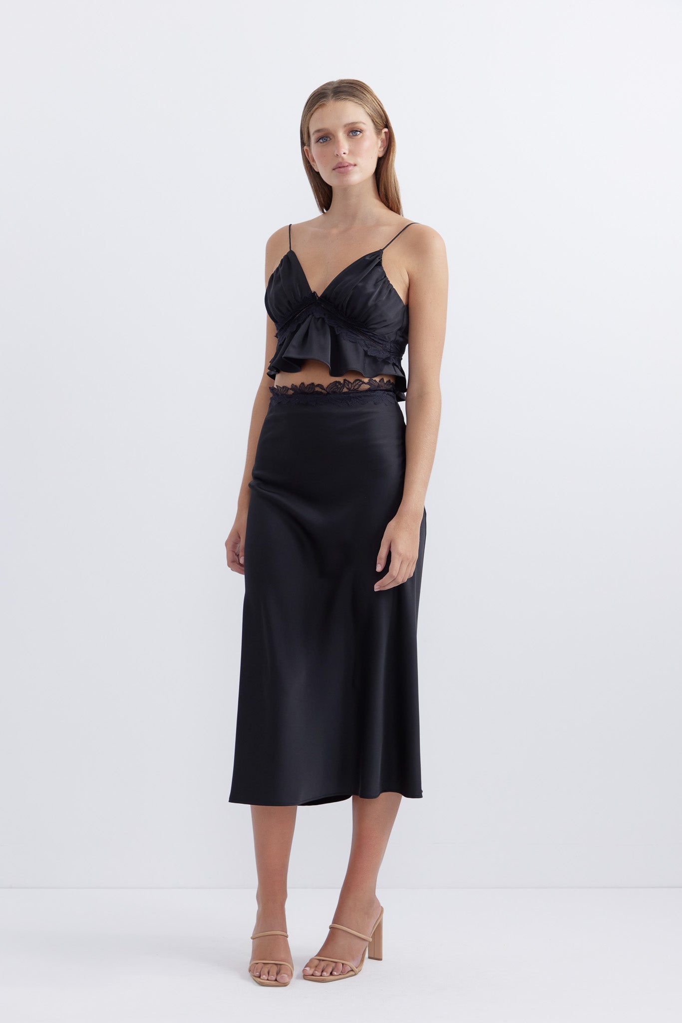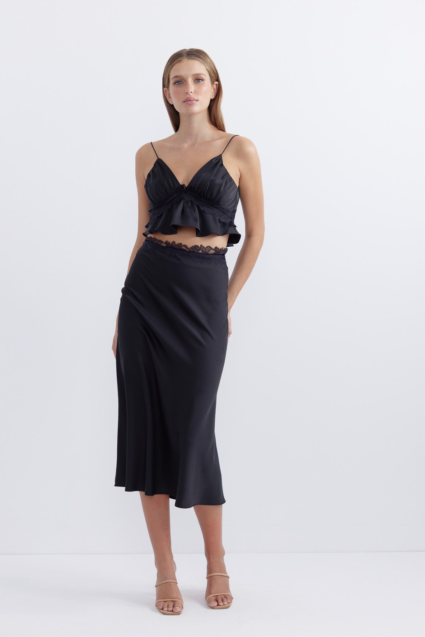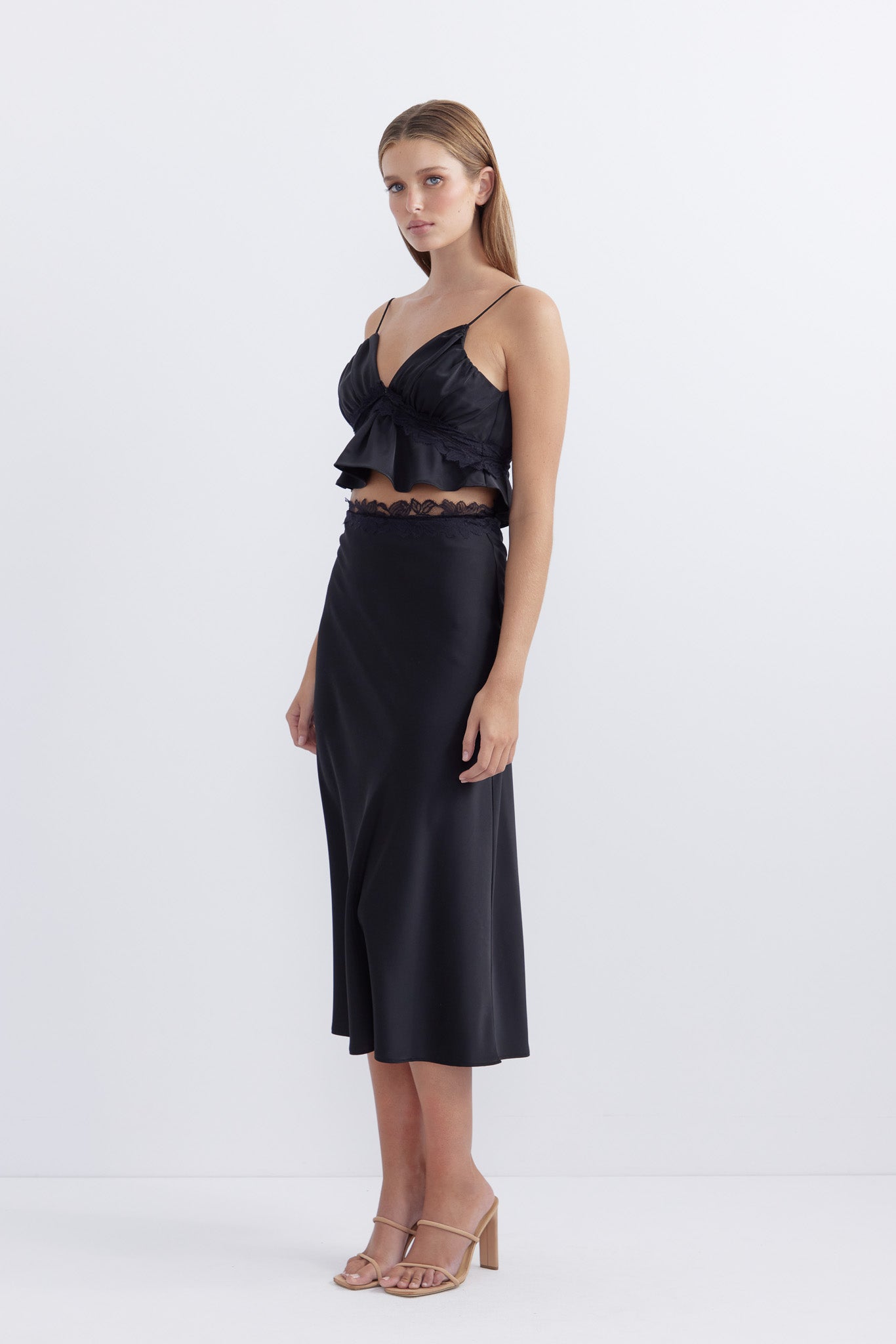 The Alight Cami by PASDUCHAS is made from a lustrous satin back crepe. This mini cami is suspended by thin rouleau straps featuring a gathered tri shaped bust with a lace trim insert through the empire seam line flaring to a fluted hem. Secured at center back with an adjustable tie for ease of fit.