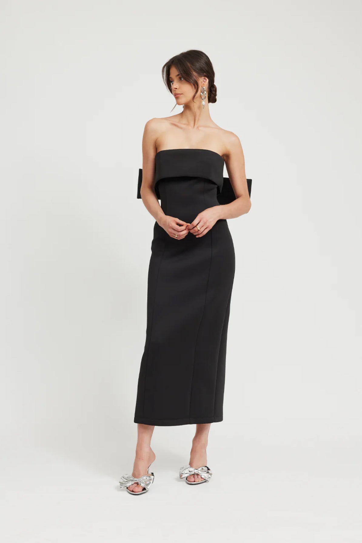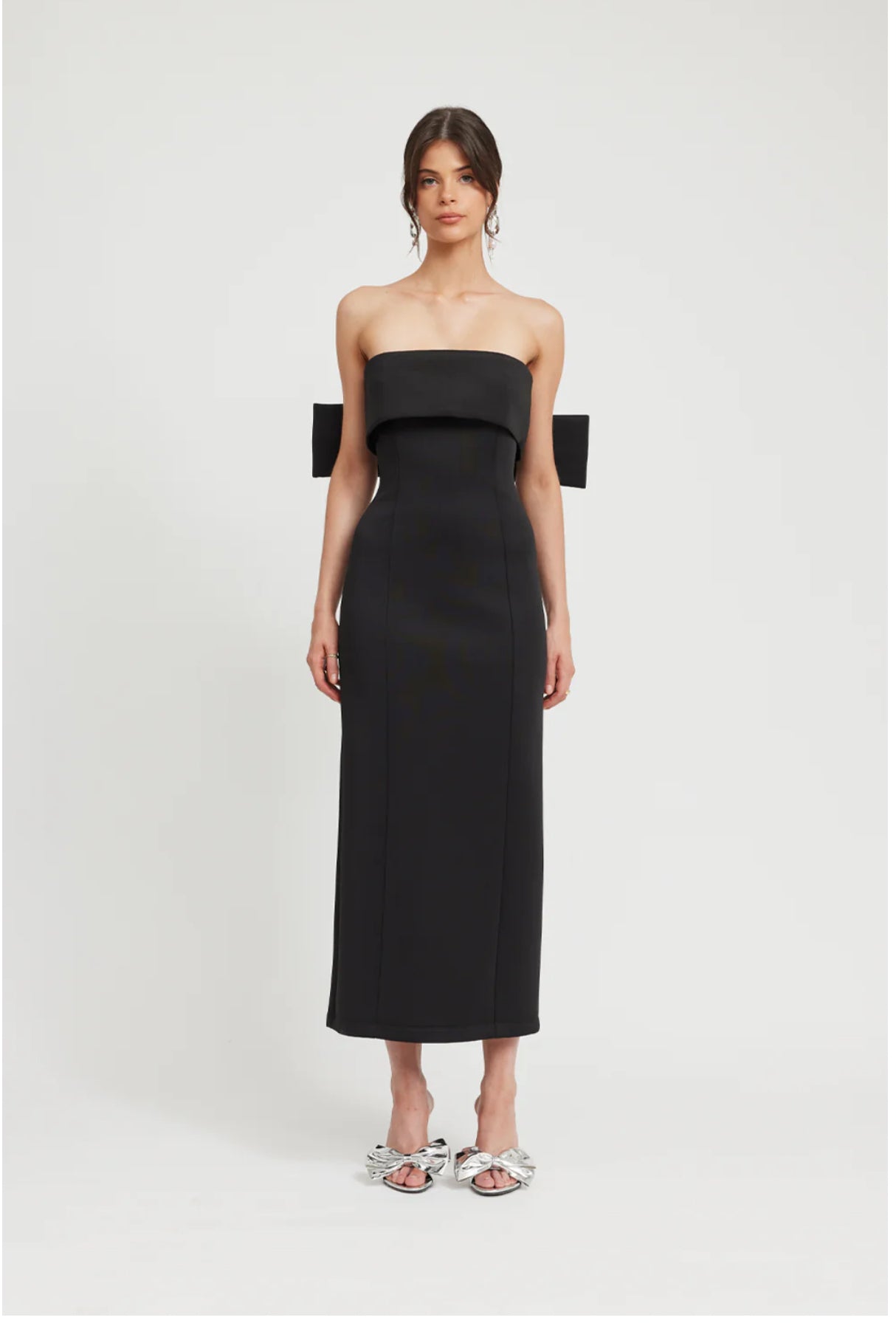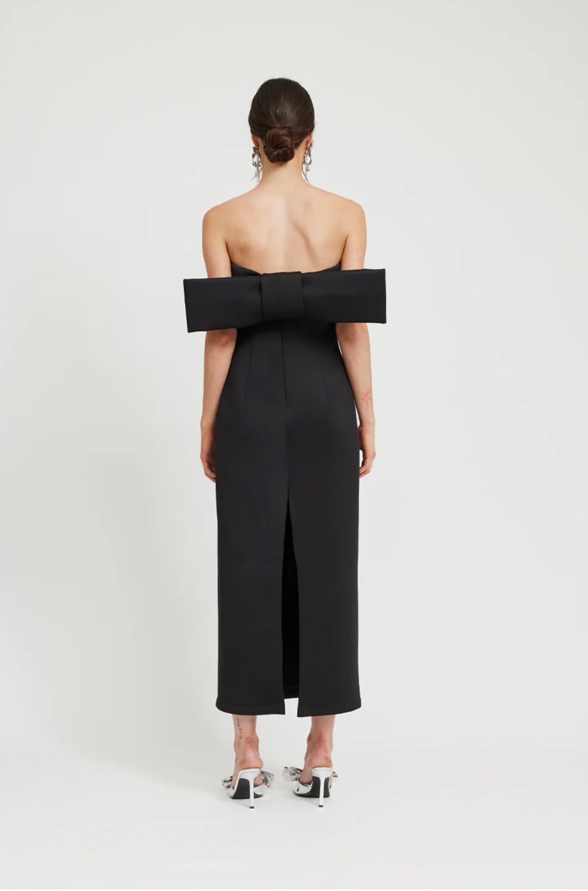 Expertly designed for formal occasions, the Arabella Dress features a bust panel layer for a flattering silhouette and internal non-slip gel tape for a secure fit. The exaggerated back neckline features a detachable bow for added versatility. Made for convenience and style, this black midi dress is a perfect addition to any wardrobe.