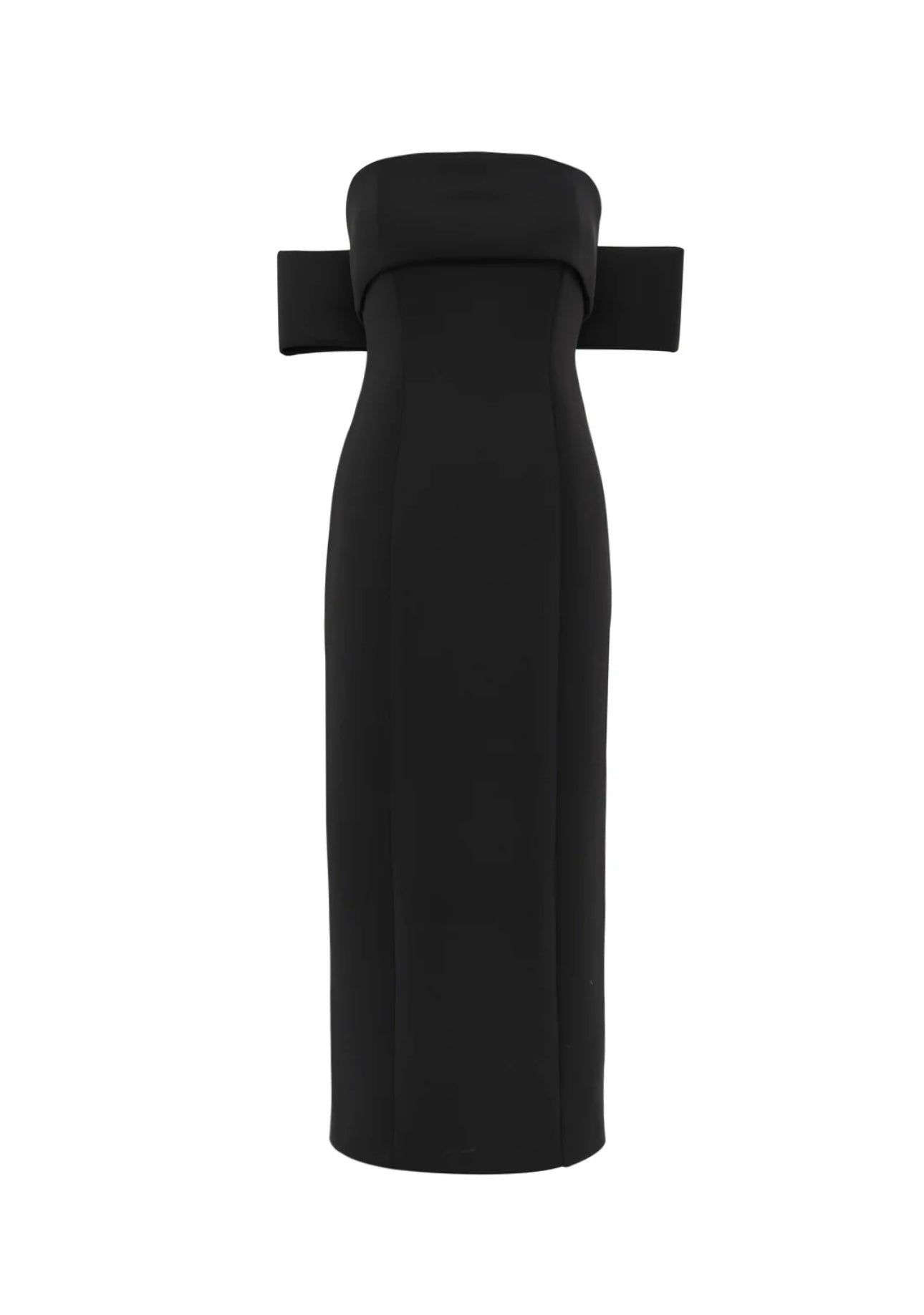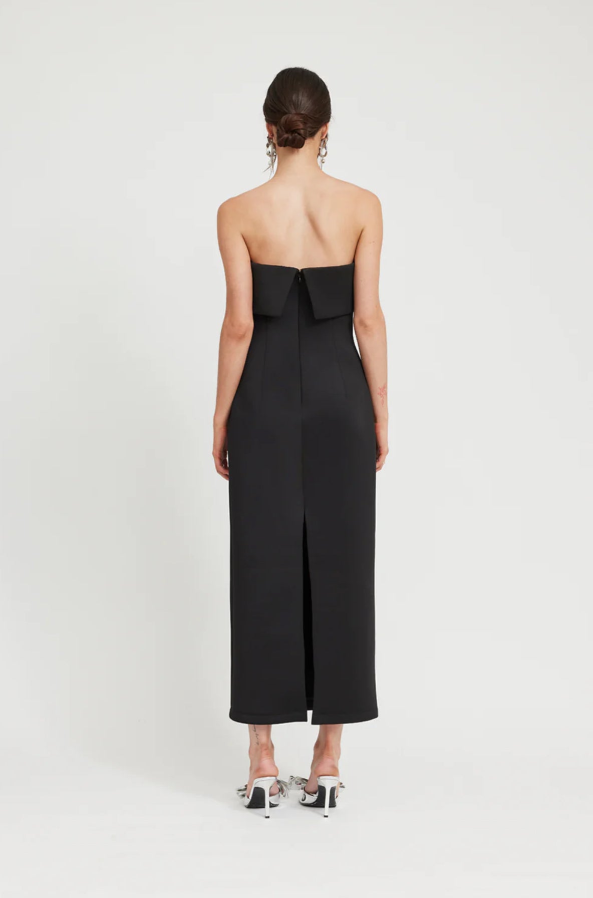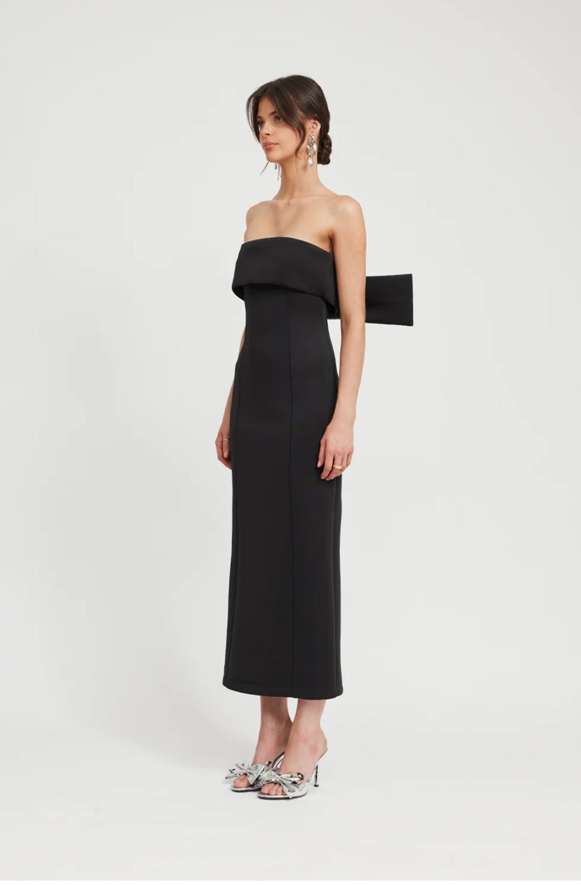 Expertly designed for formal occasions, the Arabella Dress features a bust panel layer for a flattering silhouette and internal non-slip gel tape for a secure fit. The exaggerated back neckline features a detachable bow for added versatility. Made for convenience and style, this black midi dress is a perfect addition to any wardrobe.