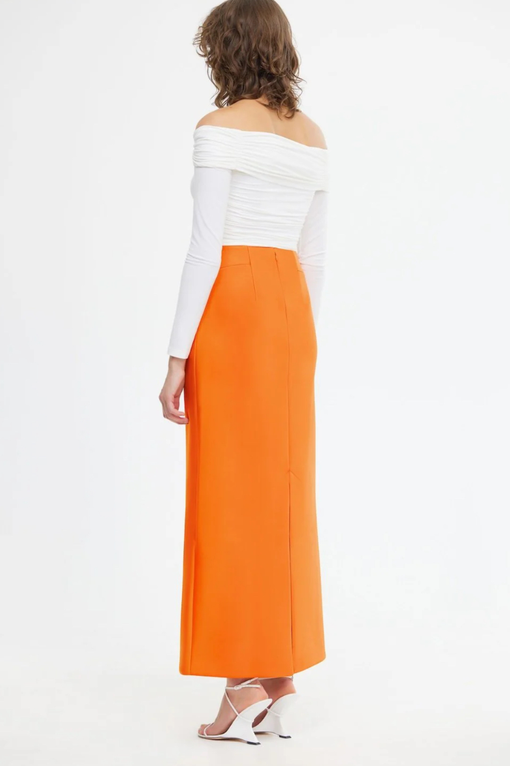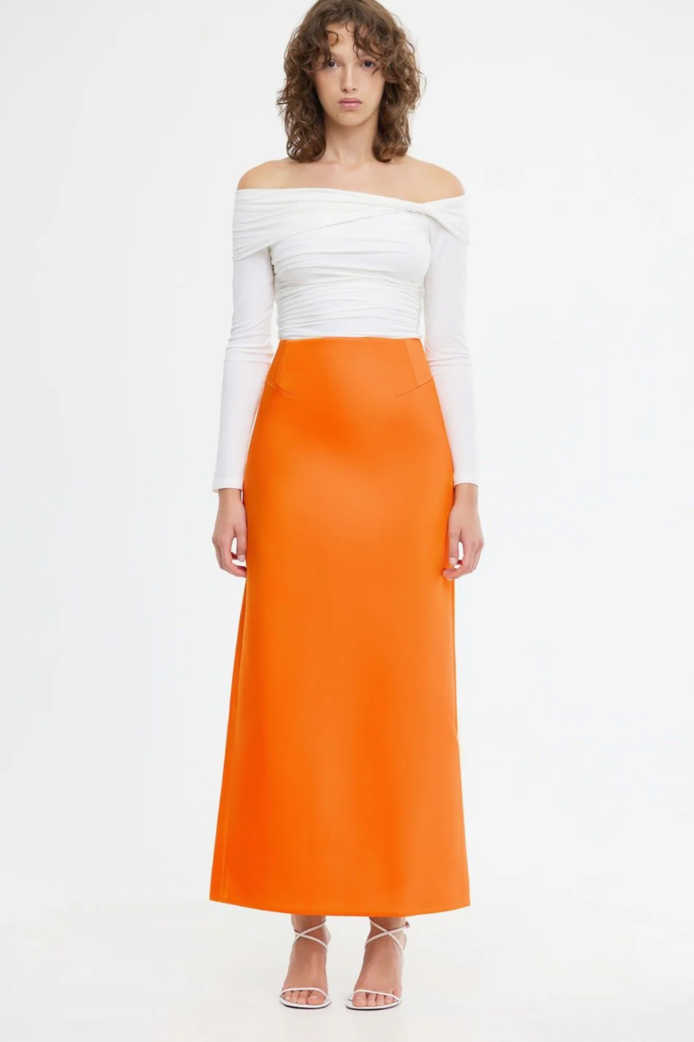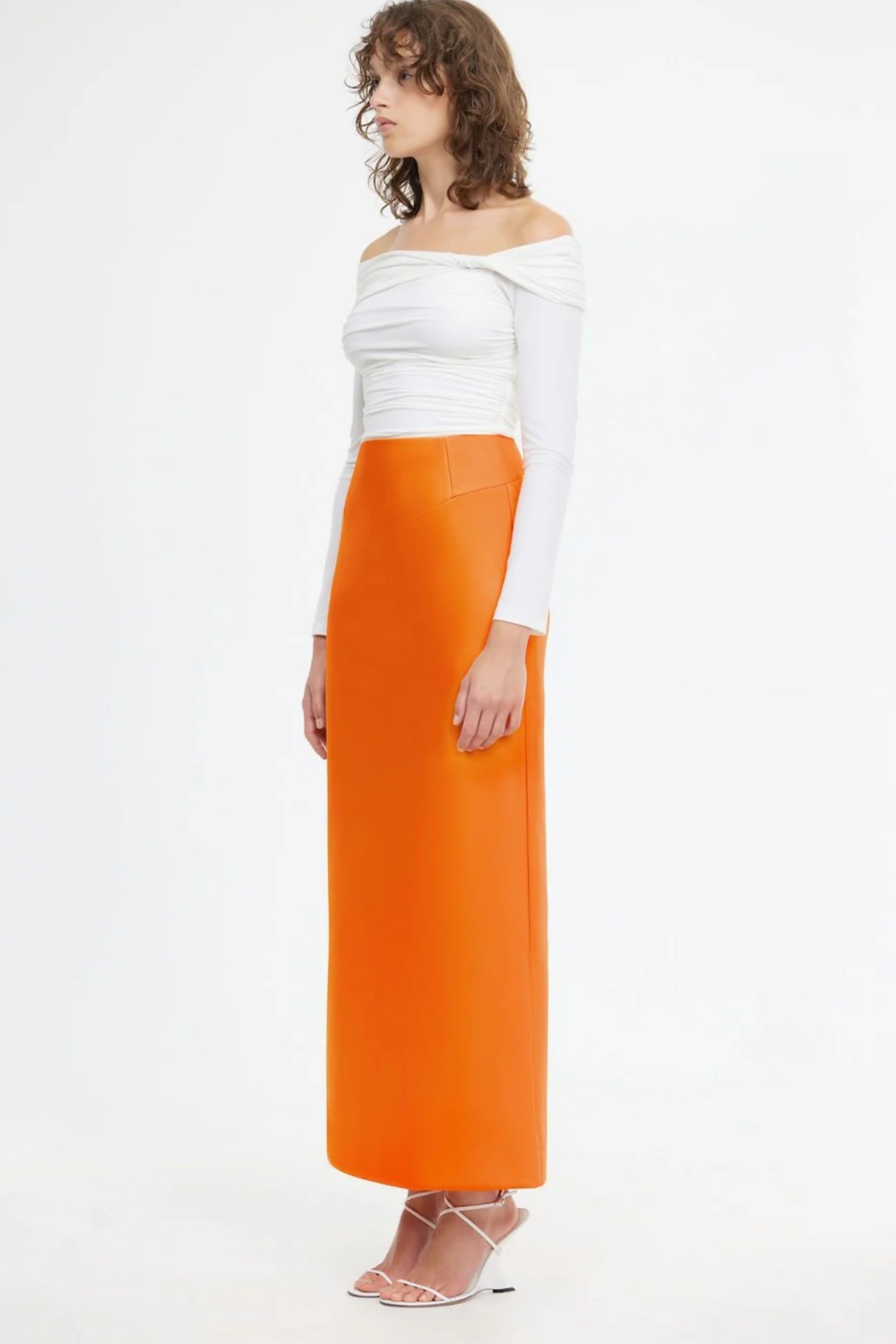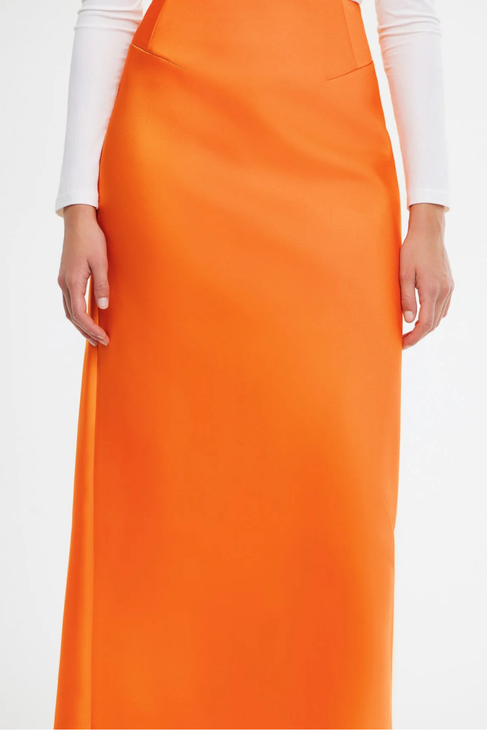 Introducing the Balderstone Skirt in Neon Tangerine, a vibrant wardrobe essential crafted from long fitted bonded fabric. This high-waisted skirt features a centre back split and a centre back invisible zipper opening for a seamless fit. Effortless to style, it offers a flattering silhouette that can be dressed up or down with ease.