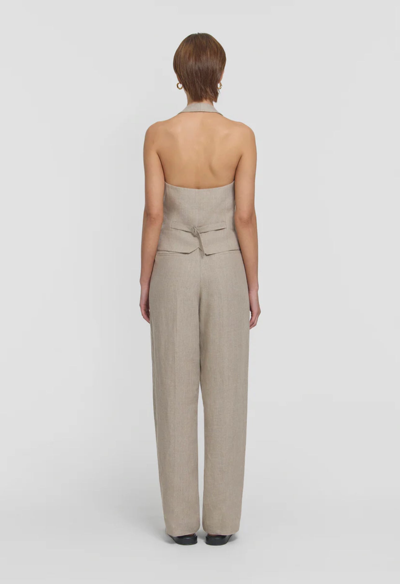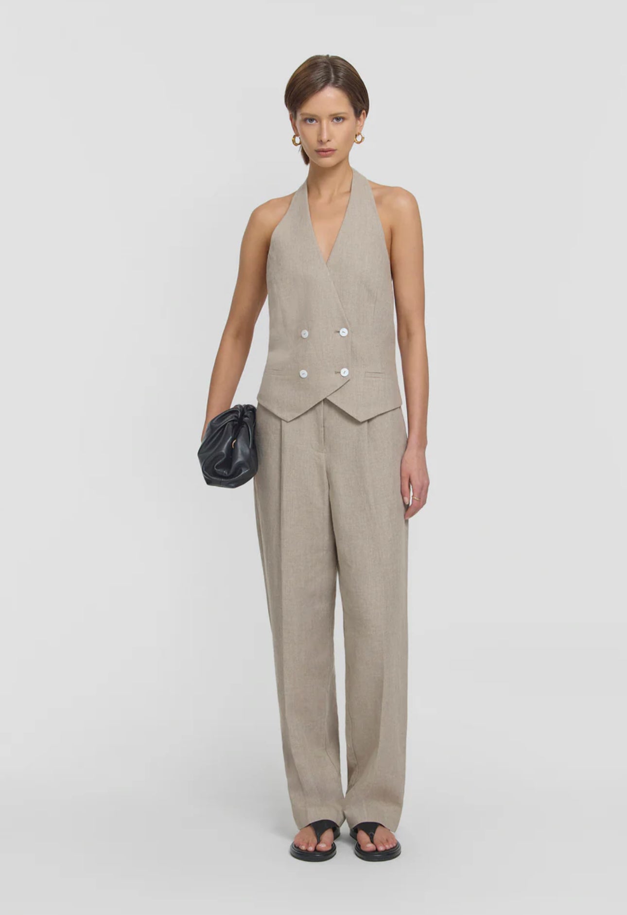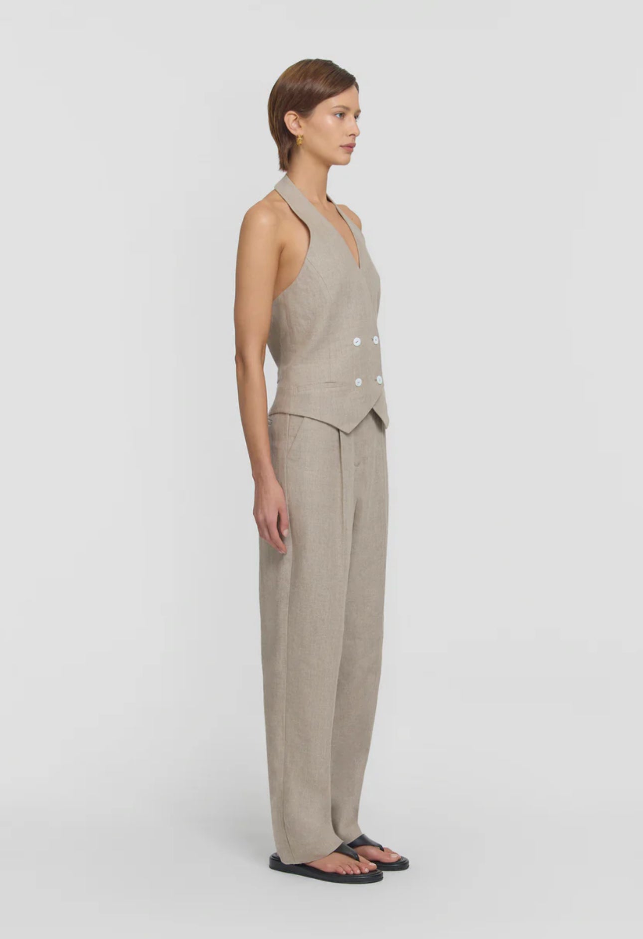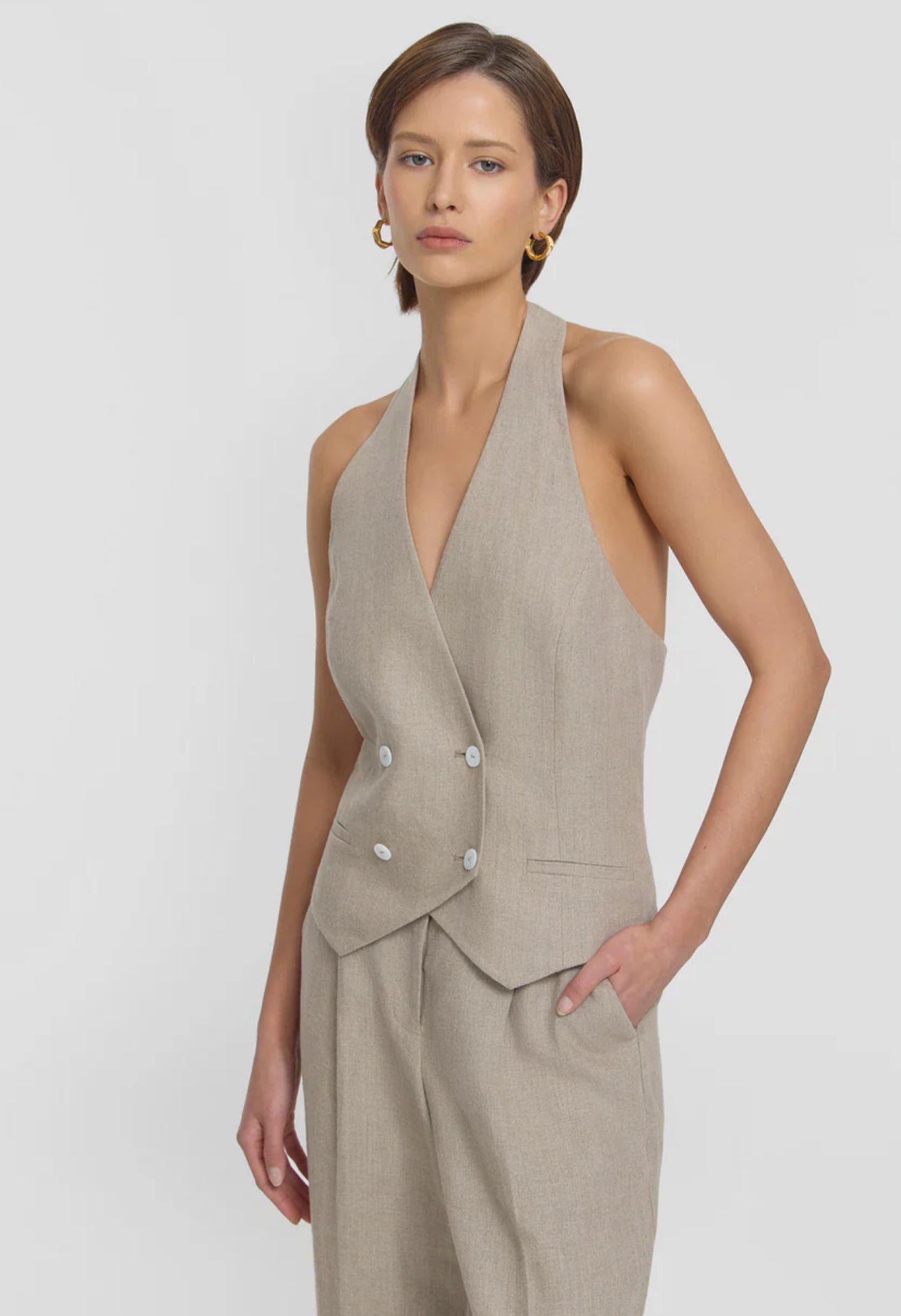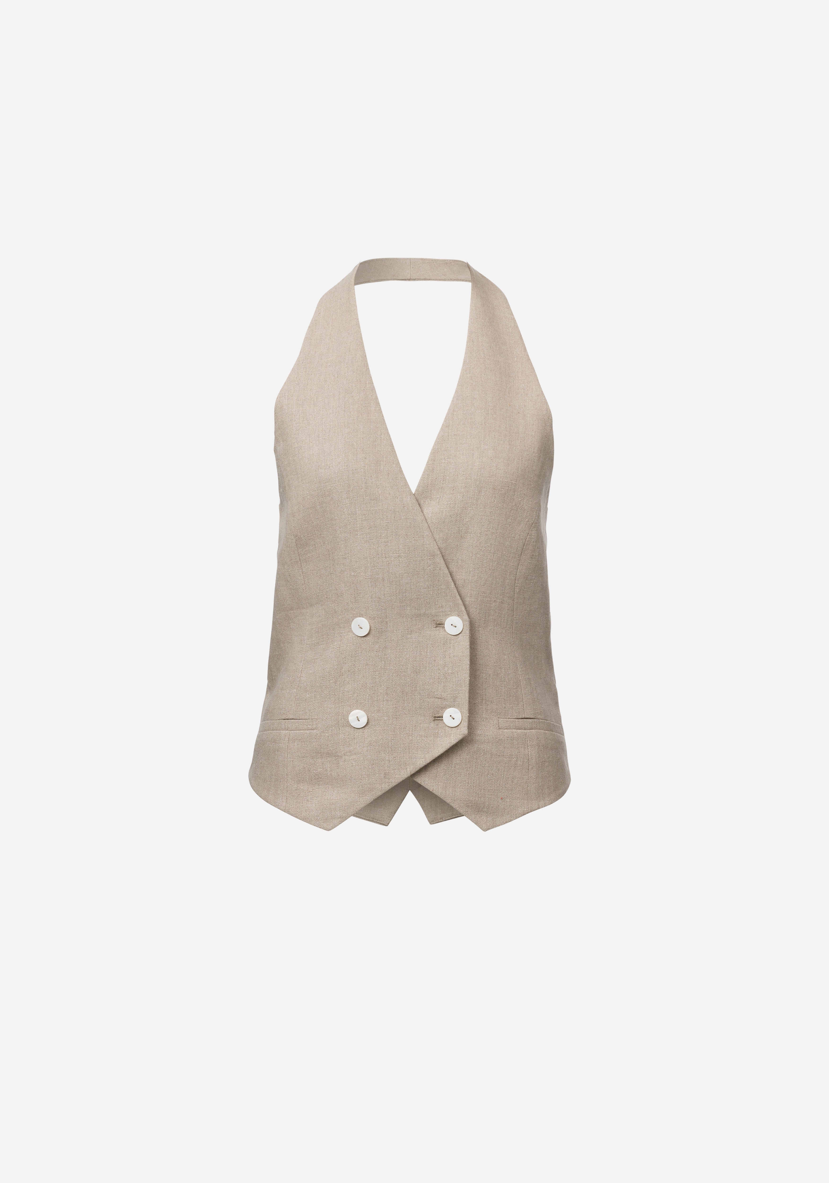 Elevate your wardrobe with the Cadence Vest, a halter-style design featuring a double-breasted front and ivory shell buttons. Crafted from luxurious natural oatmeal linen, it includes an adjustable back waist tab and refined front welt pockets. Pair it with this season’s oatmeal-hued pieces for a chic, effortless take on tonal set dressing.