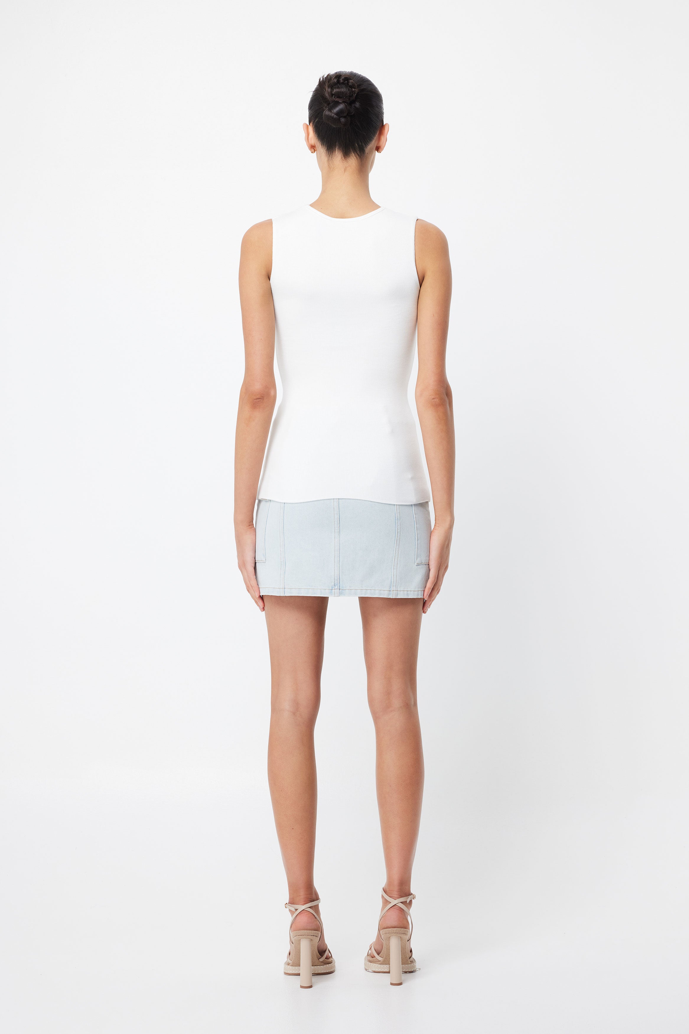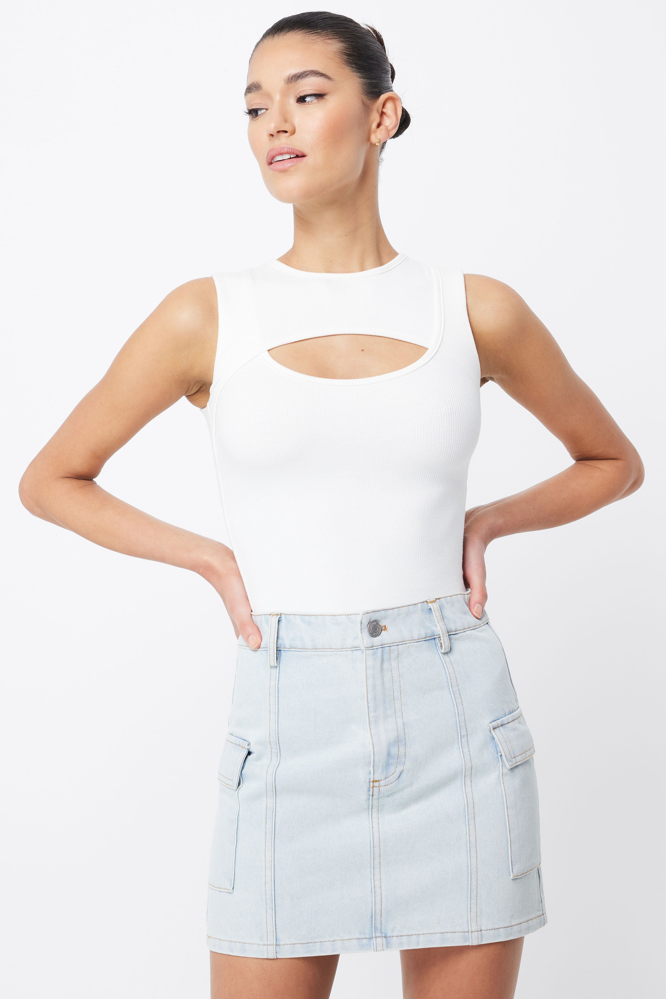 The Cold Shoulder Top in White will become a wardrobe staple for any time of the year. The top features a bodice cut-out, long-line length and a double layer fine rib fabrication. Pair with the overpass mini skirt for a simple and chic outfit.