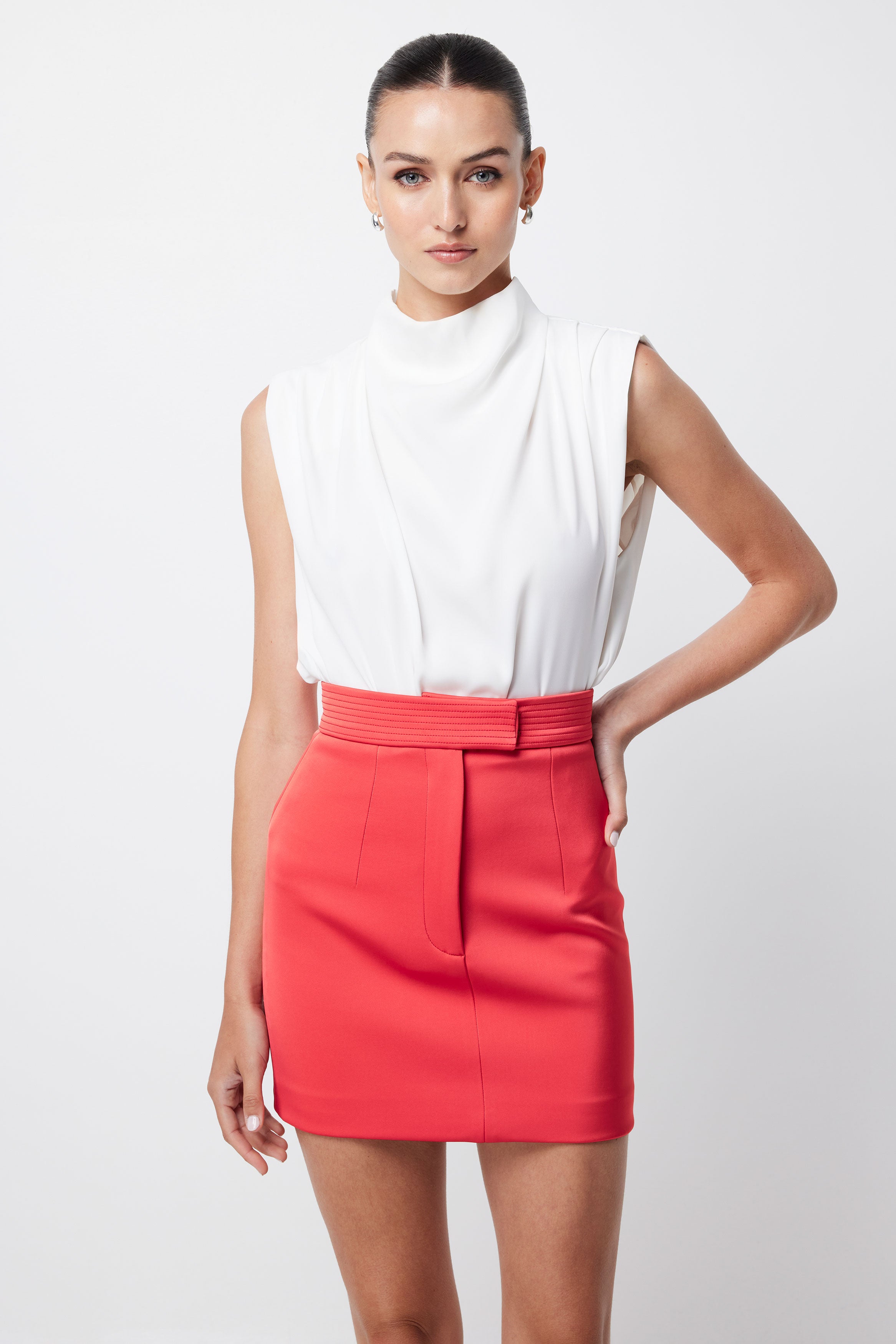 The Elysium Mini Skirt boasts a simple silhouette with clean lines and a bold watermelon hue. Featuring a high waist rise, a button and zip fly closure, and a thick waist band with design seams. This piece is designed to be dressed up or down, style with the Dare To Dream Top in white for a sophisticated look.