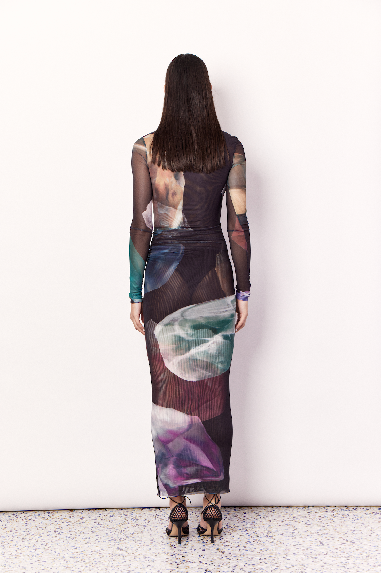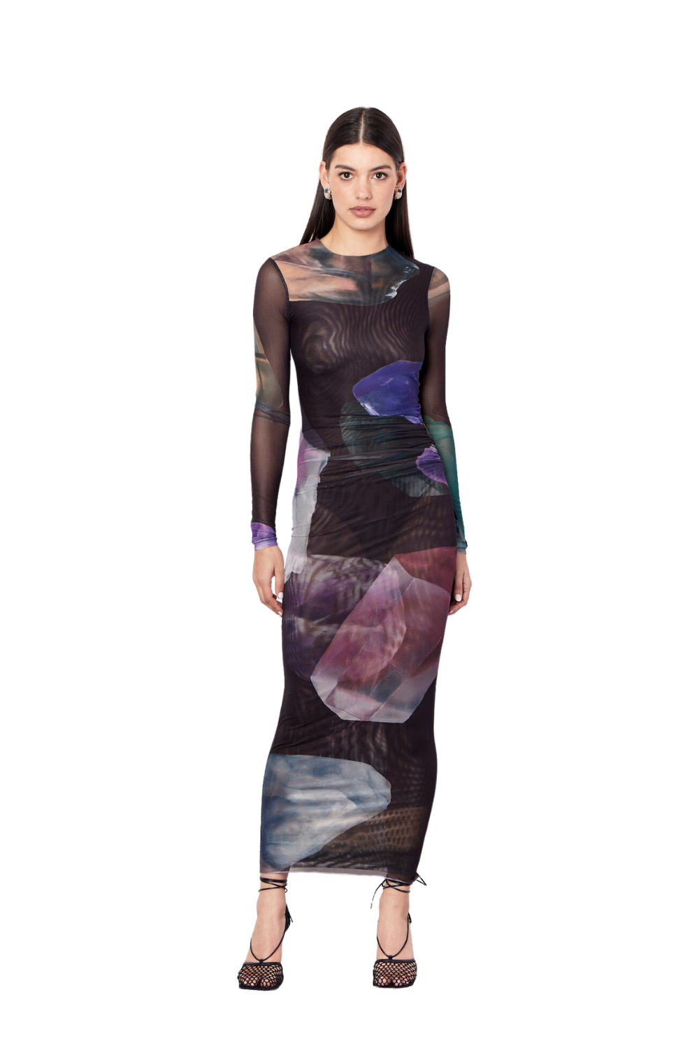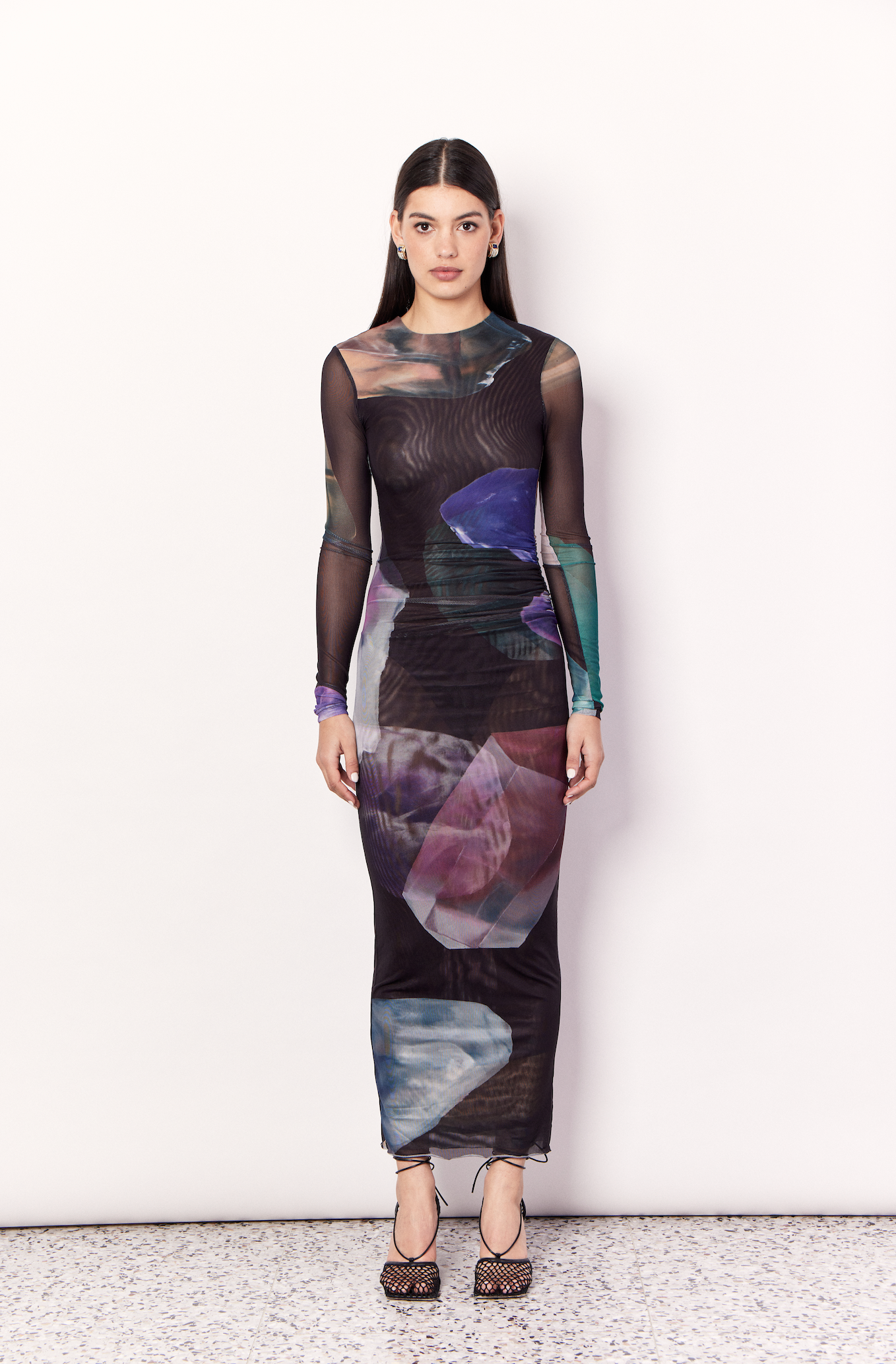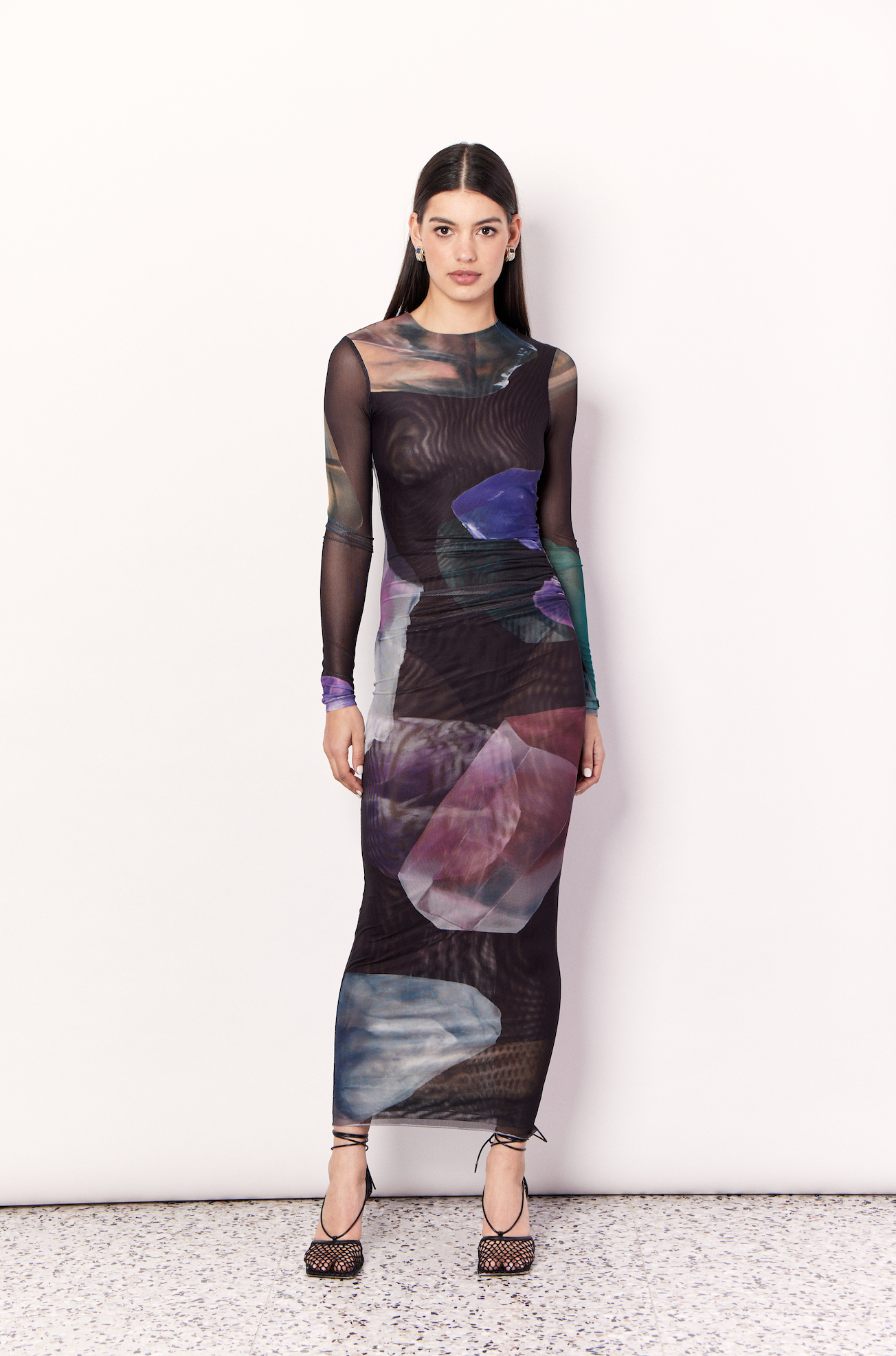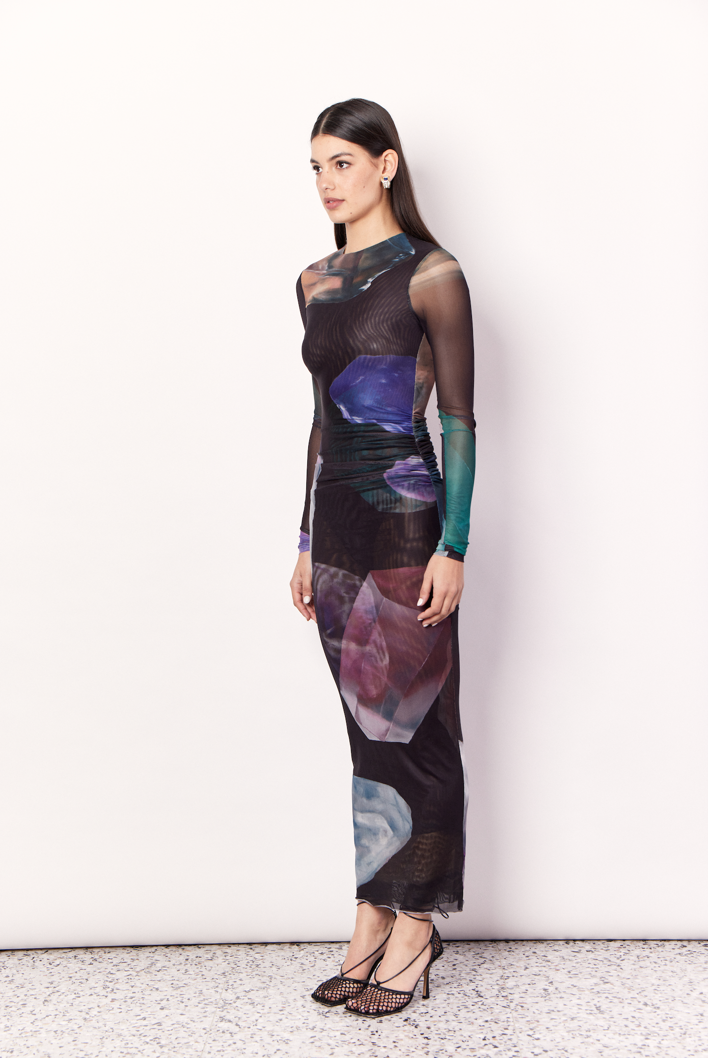 The Gemstone Long Sleeve Mesh Maxi Dress is an elegant and figure hugging silhouette. It is crafted with an ultra-soft mesh fabrication that is opaque through the body and sheer through the arms in the opulent Gemstone Print, designed exclusively for Romy.