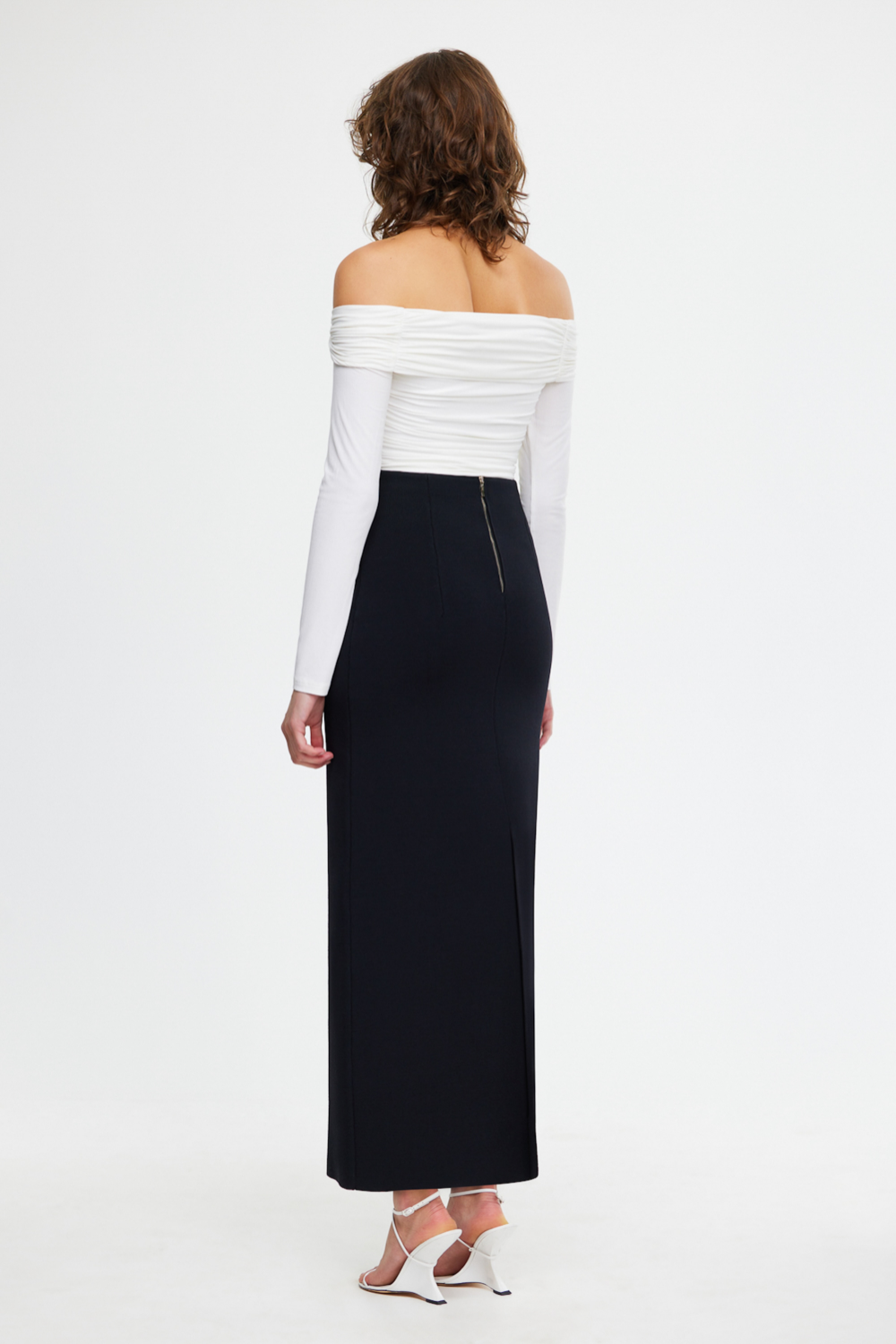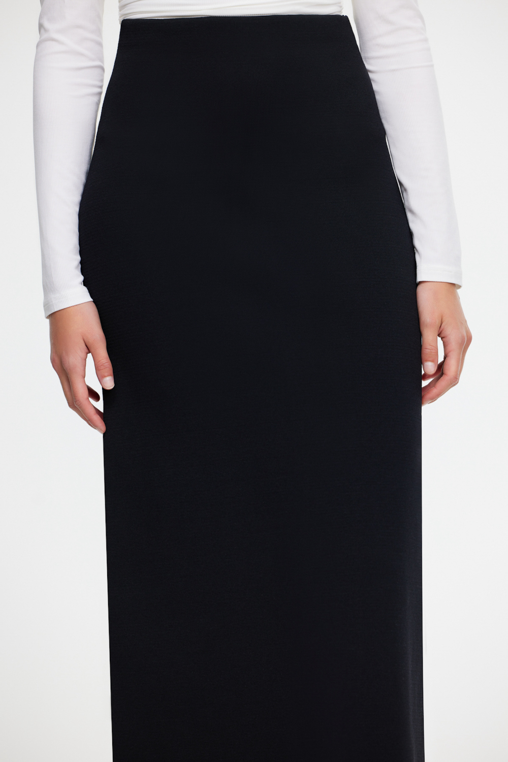 Introducing the Heydon Midi Skirt in Black, crafted from a luxurious heavy crepe knit blend. This long skirt features a knit construction for comfort and durability, with darts at the waist for shaping. The high-waisted silhouette offers a flattering fit, complemented by a centre back exposed gold zip opening that adds a touch of elegance. Complete with a centre back split, the Heydon Midi Skirt combines versatility with timeless style.