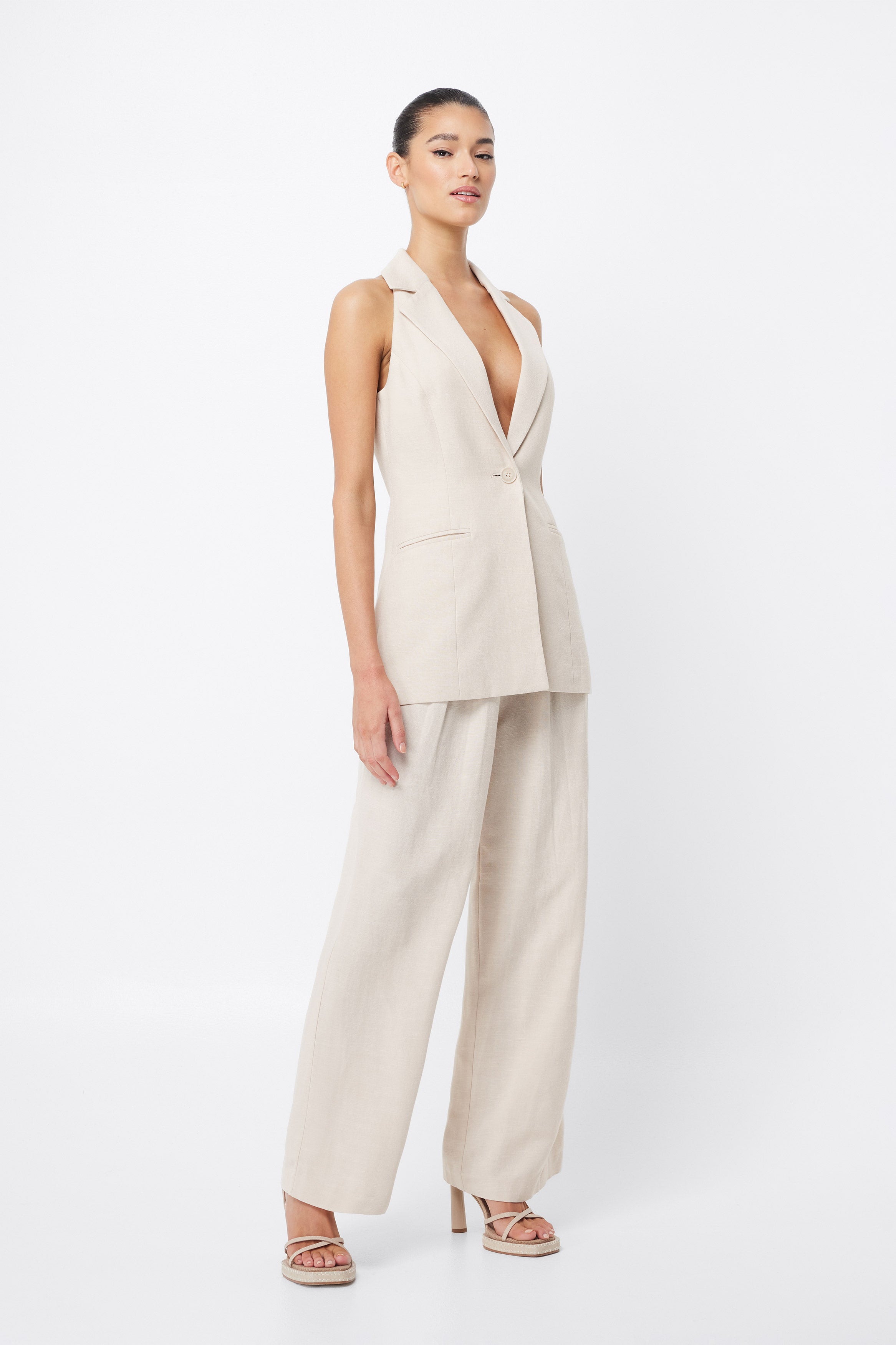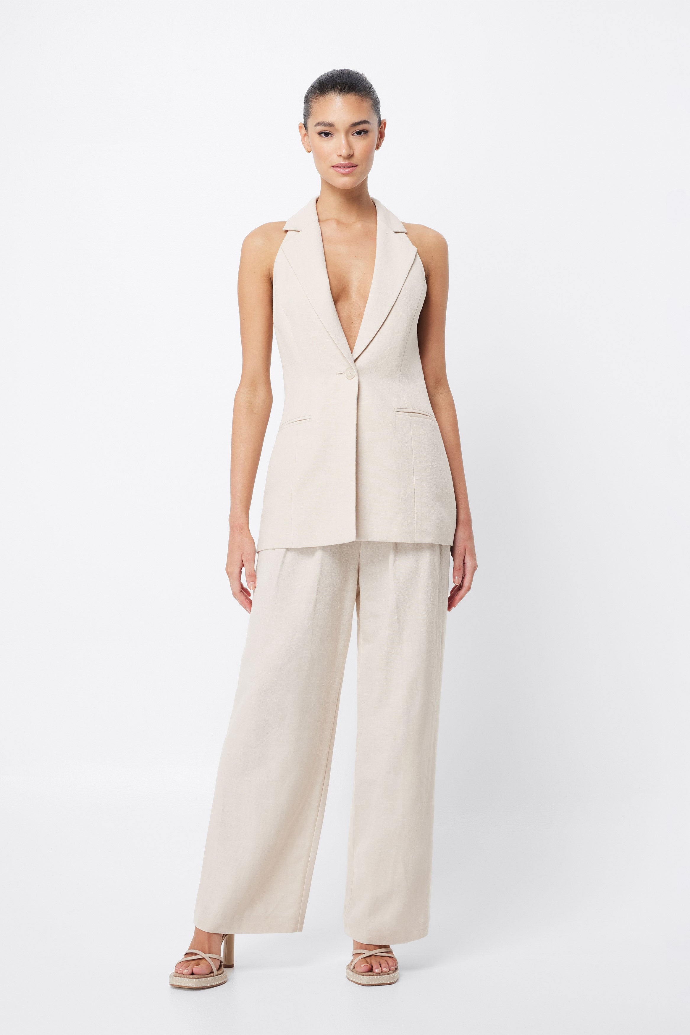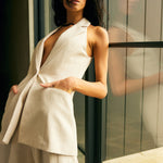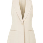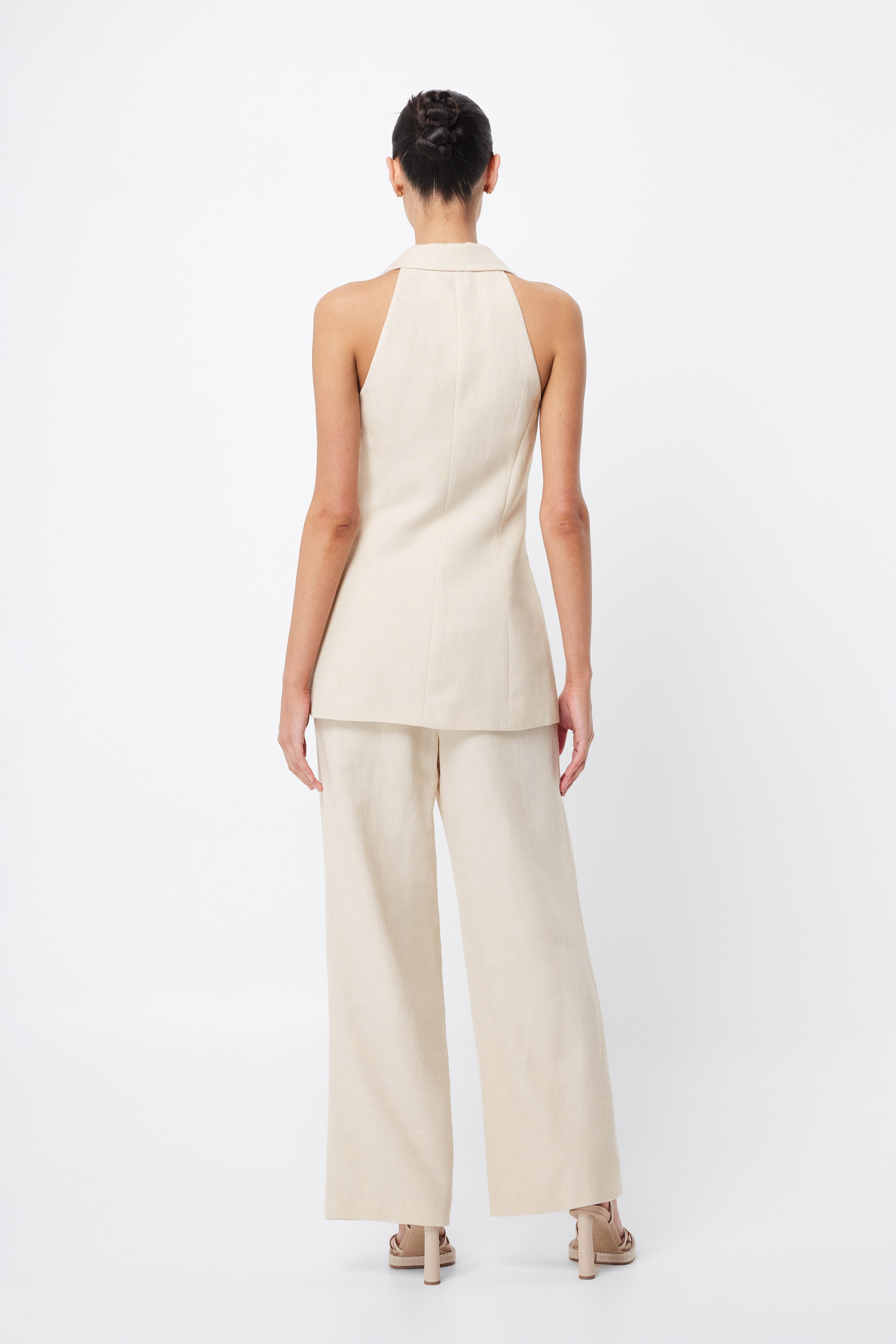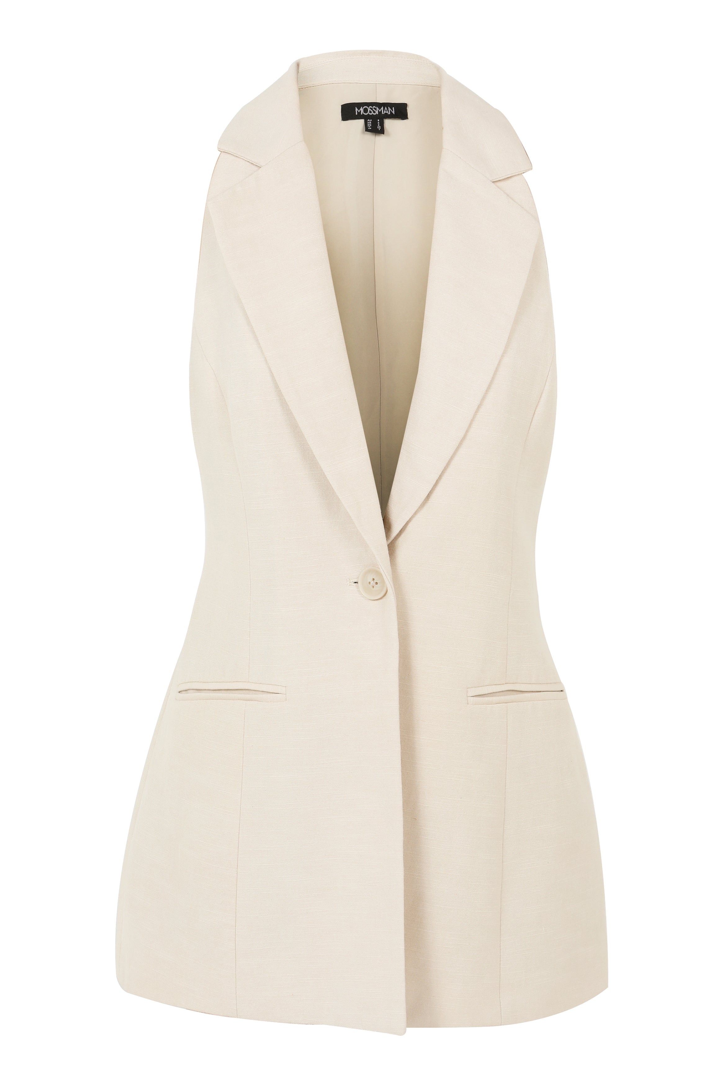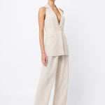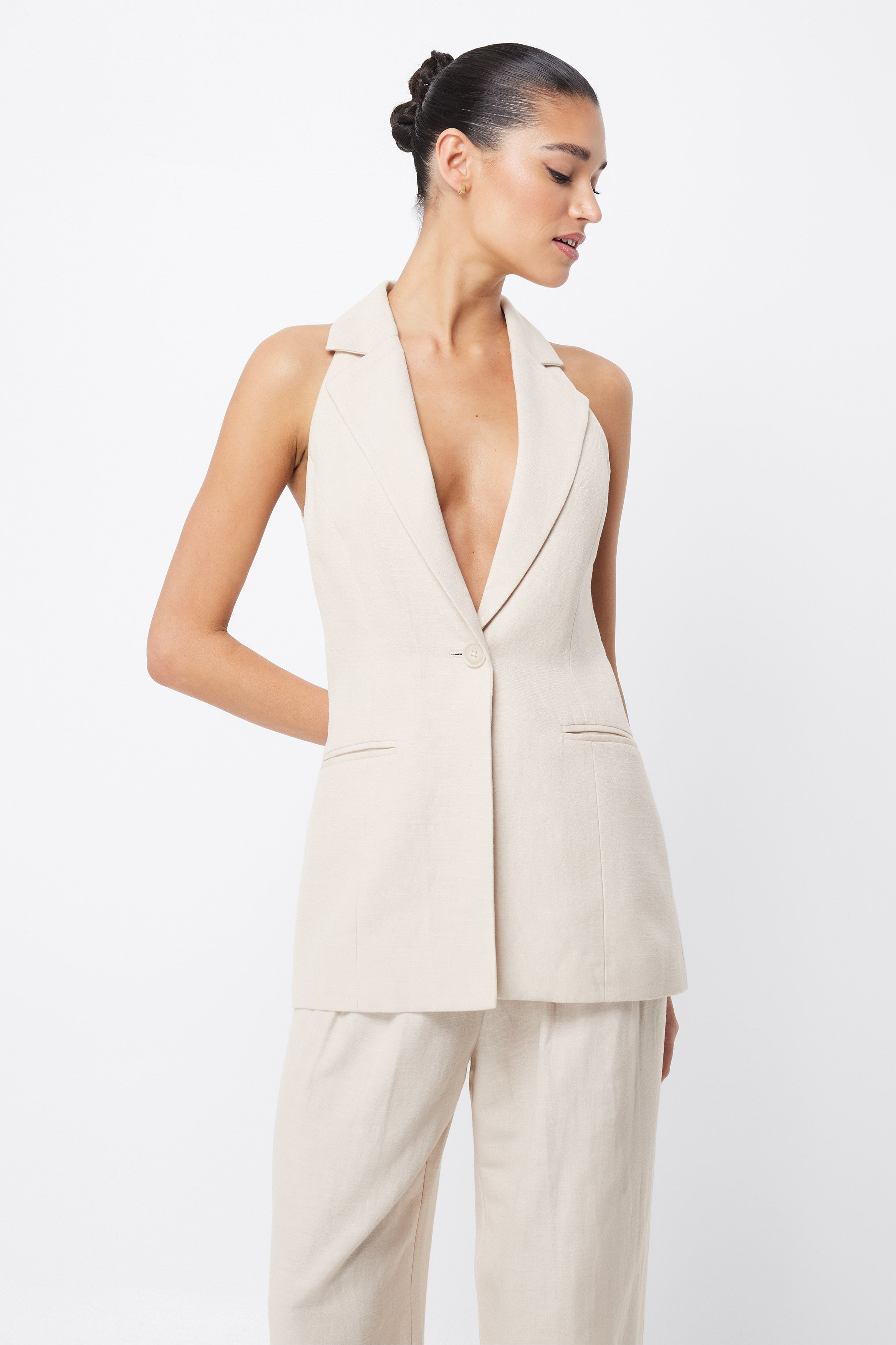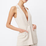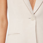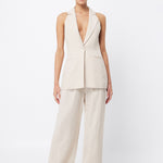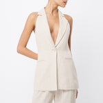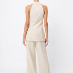 The Novelty Top in beige is a twist on the timeless vest. Made from a linen-blend fabrication, the top showcases a structured and collared neckline, long-line length, and a lower back. Pair with the Novelty pant for an all-linen look.