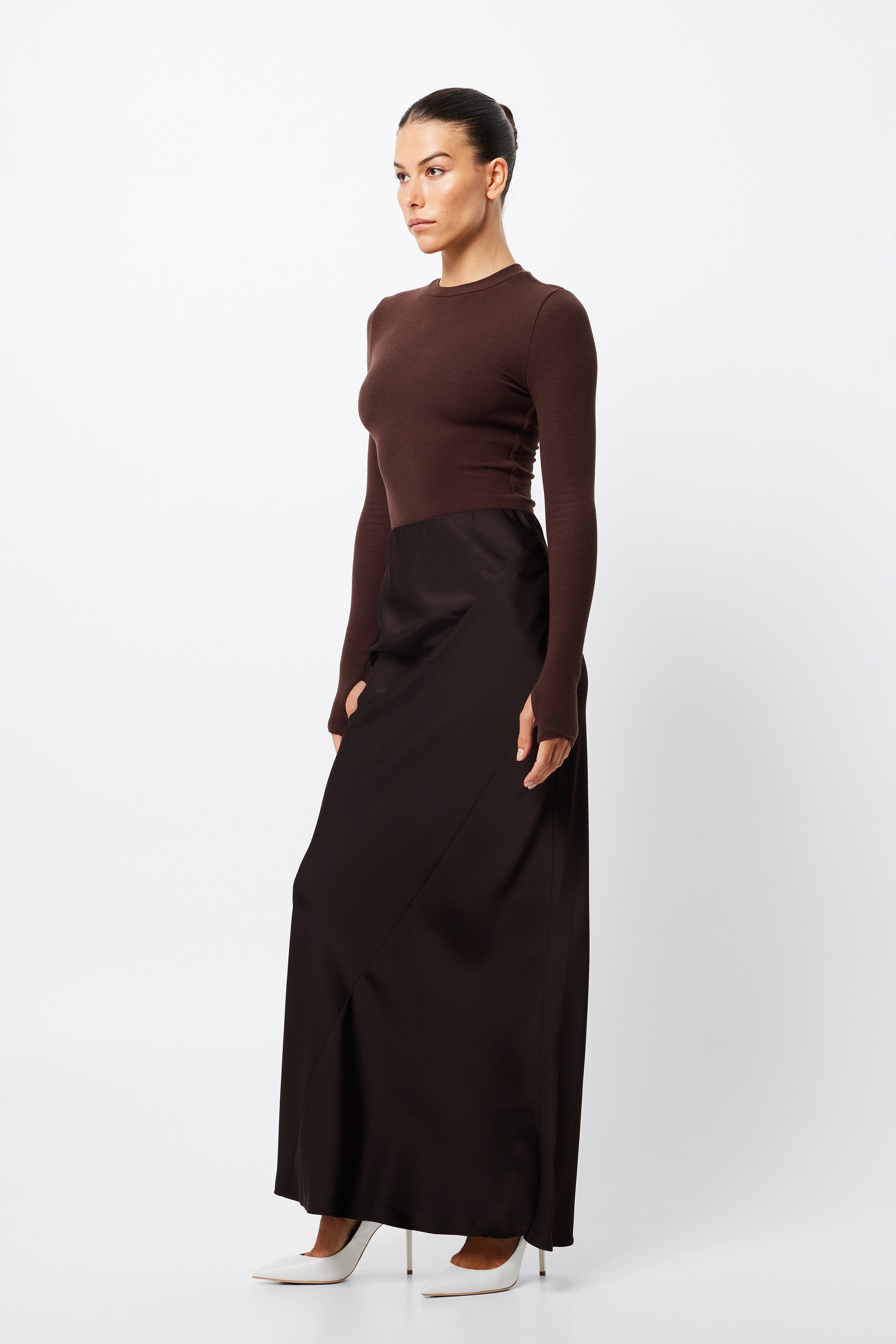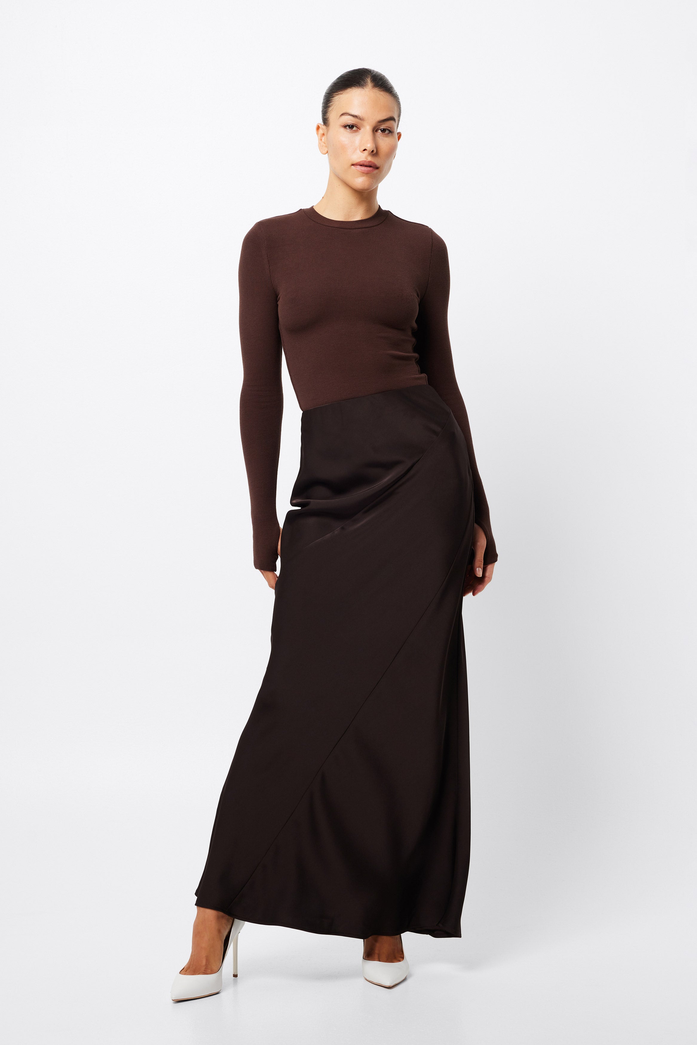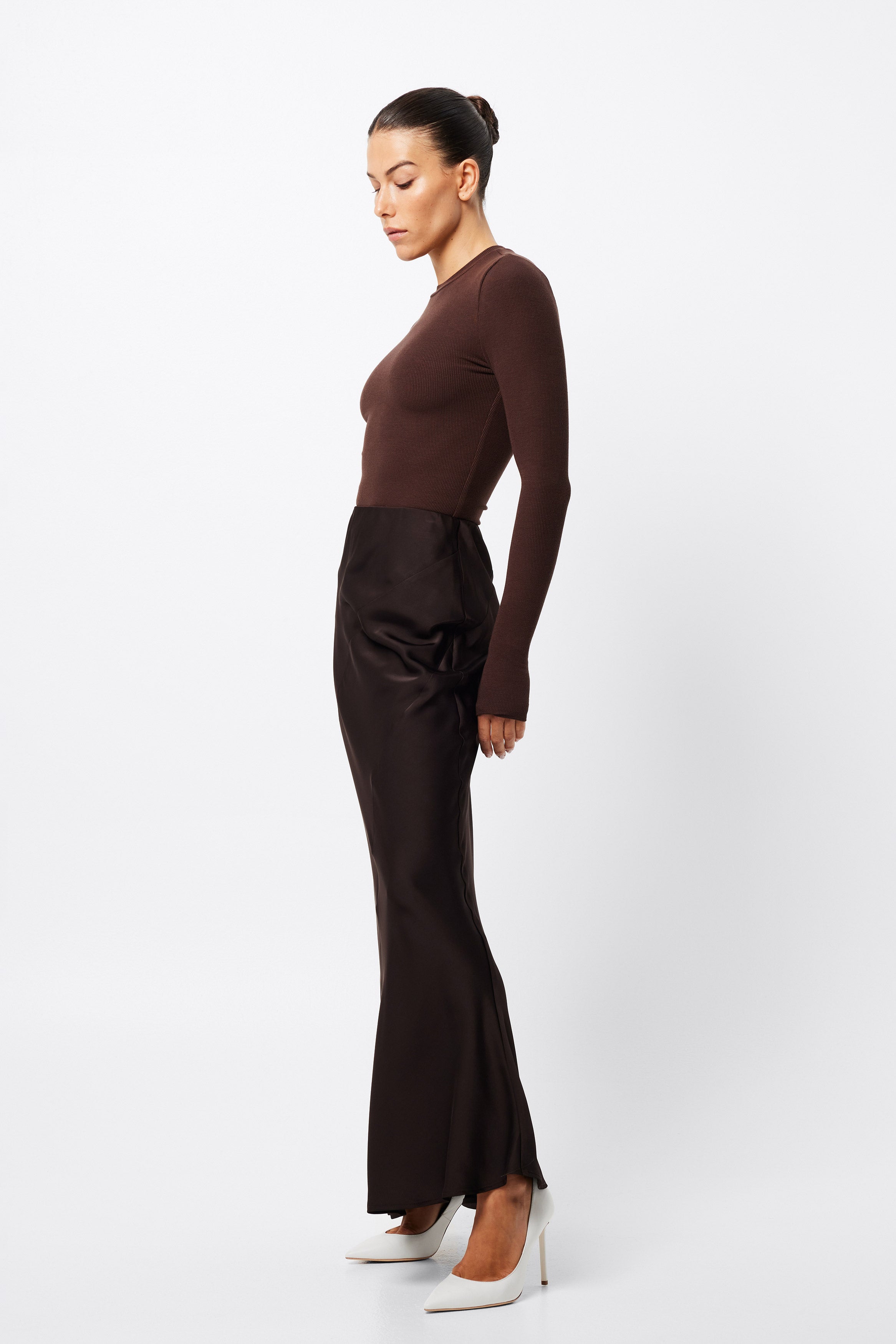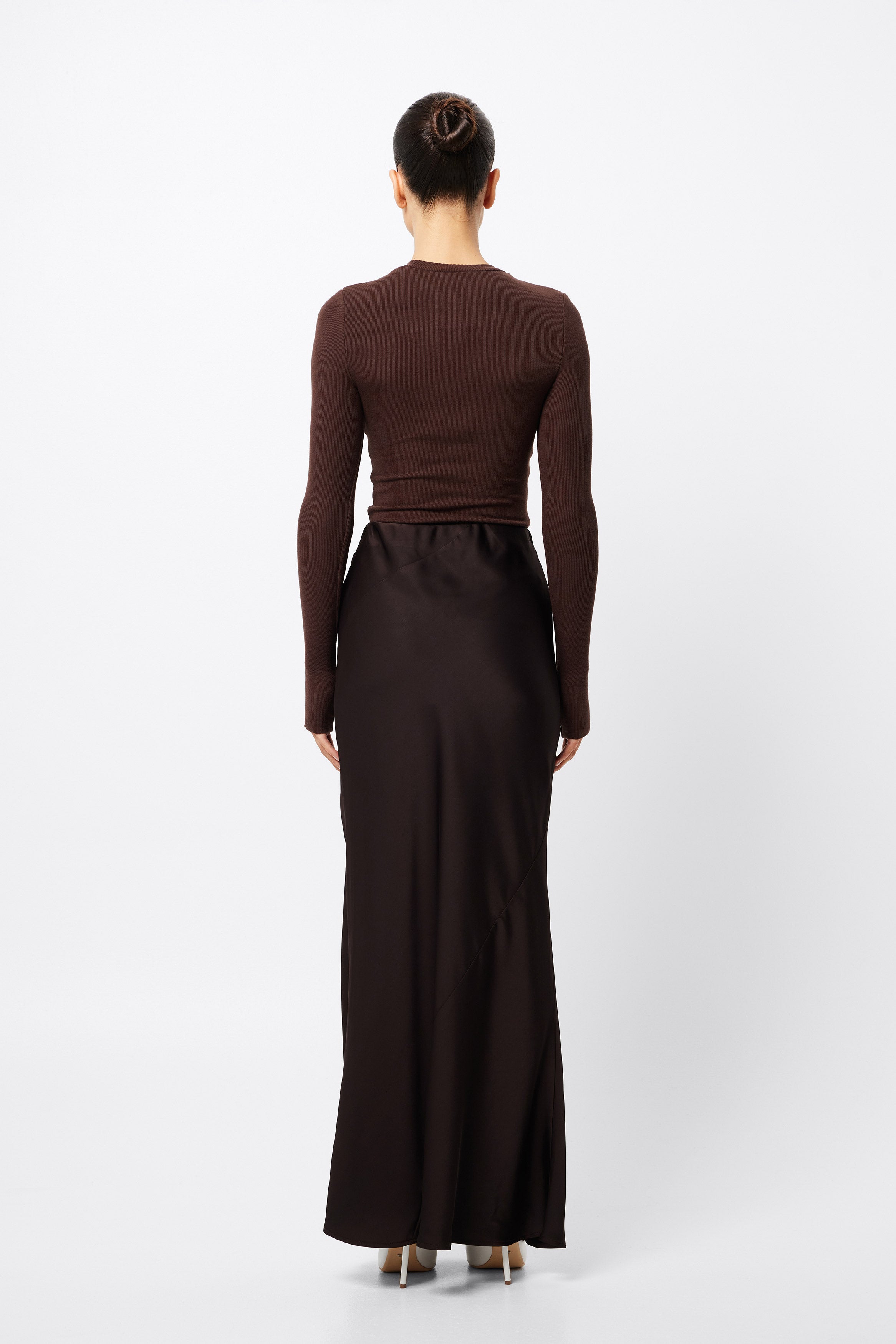 The Renaissance Maxi Skirt in Chocolate is a timeless piece in a soft lustrous fabrication. This effortlessly transitions from day to evening and makes for a perfect match with a simple fitted top. Wear with a tailored blazer for a desk to dinner look, or dress down with a knitwear and boots for cooler days.