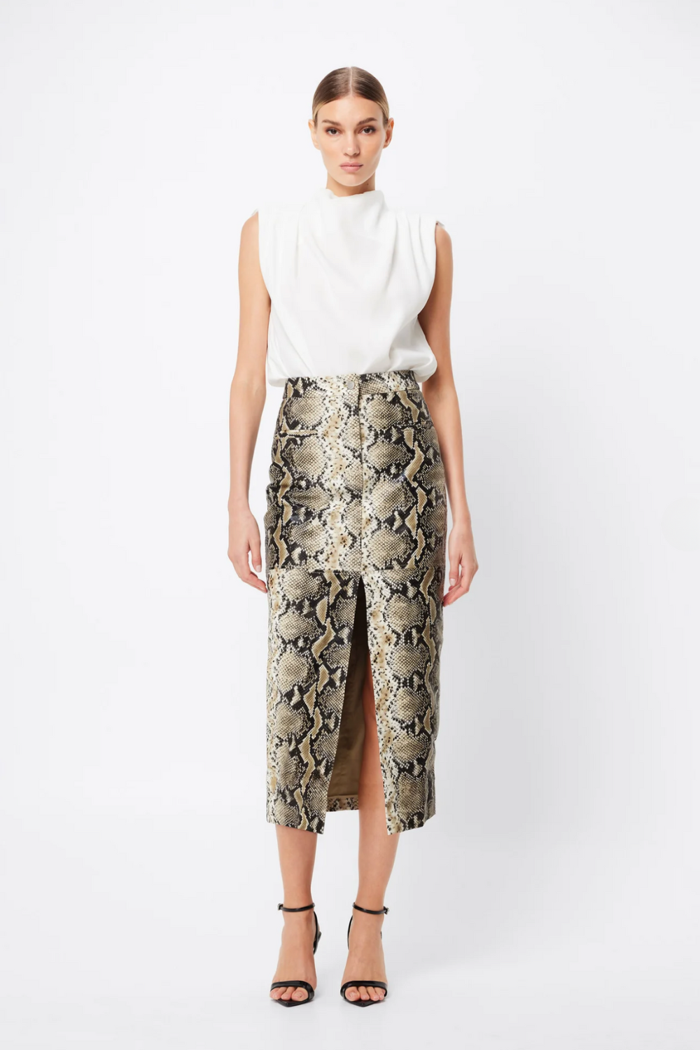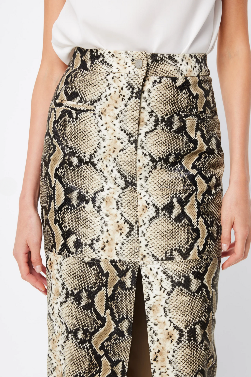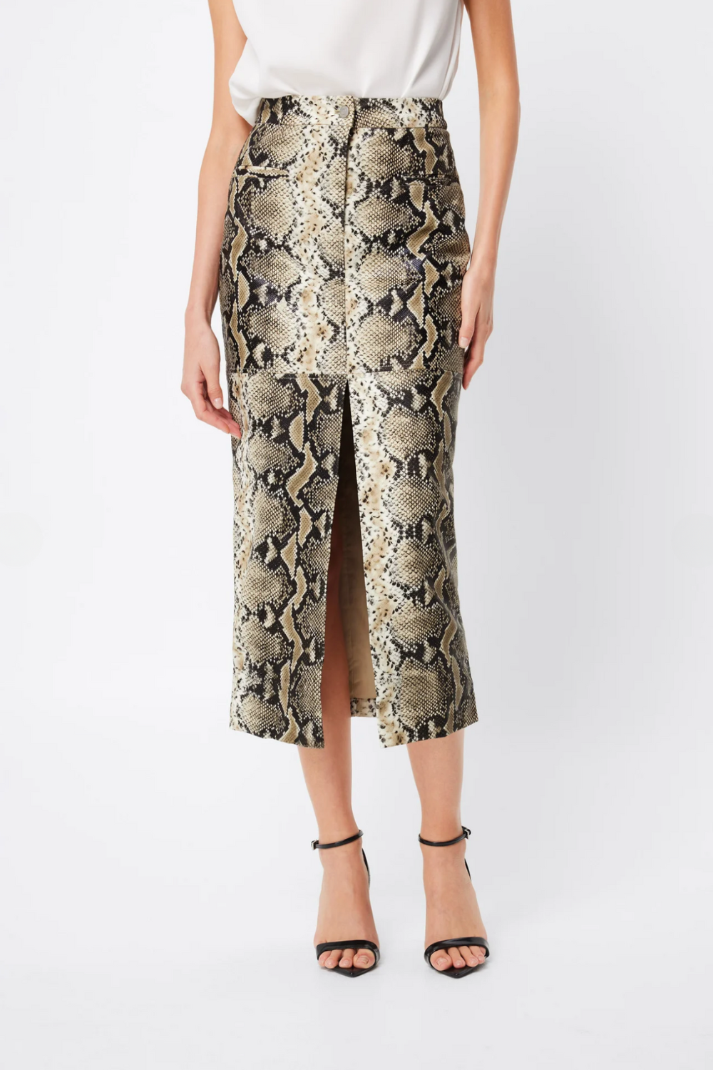 The Restless Midi Skirt in serpent offers a bold yet elegant look. Its fitted silhouette, and daring front split adds a hint of drama and accentuates your curves. Perfect with our Dare To Dream Top and black heels for your next date night, or knitwear and boots for a more casual feel.