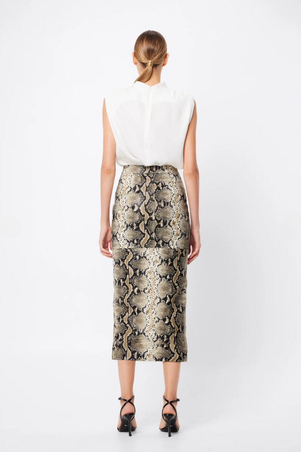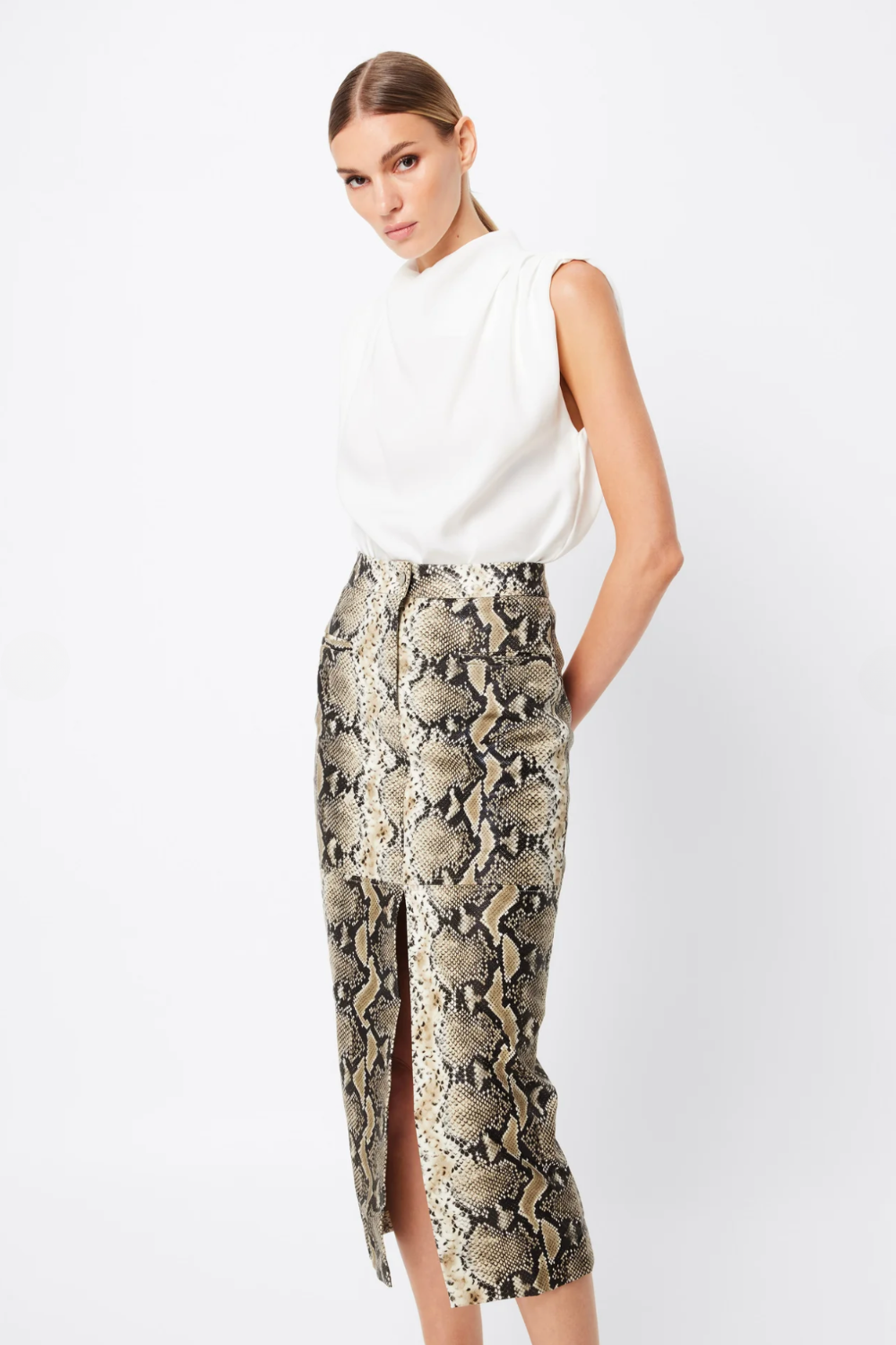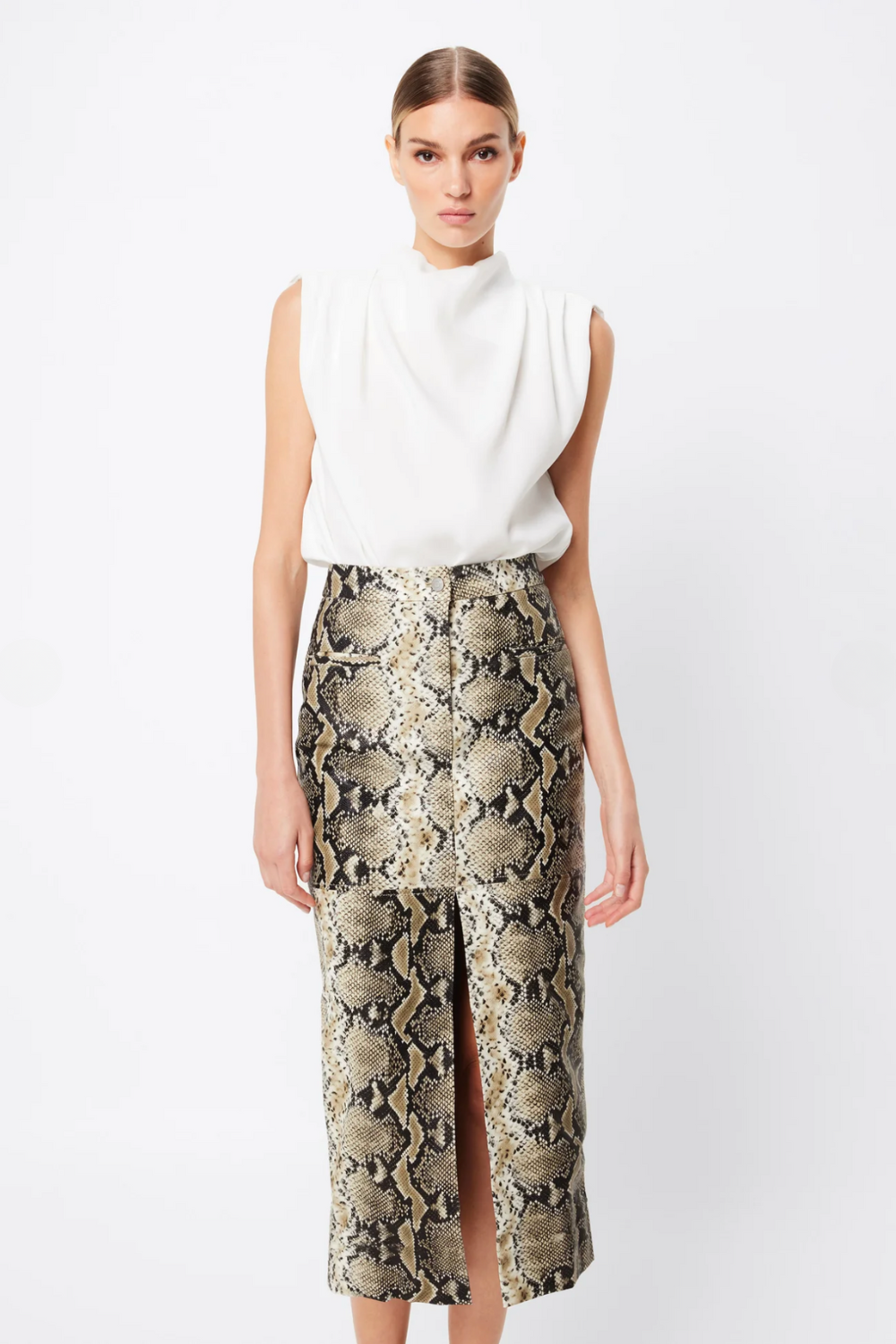 The Restless Midi Skirt in serpent offers a bold yet elegant look. Its fitted silhouette, and daring front split adds a hint of drama and accentuates your curves. Perfect with our Dare To Dream Top and black heels for your next date night, or knitwear and boots for a more casual feel.
