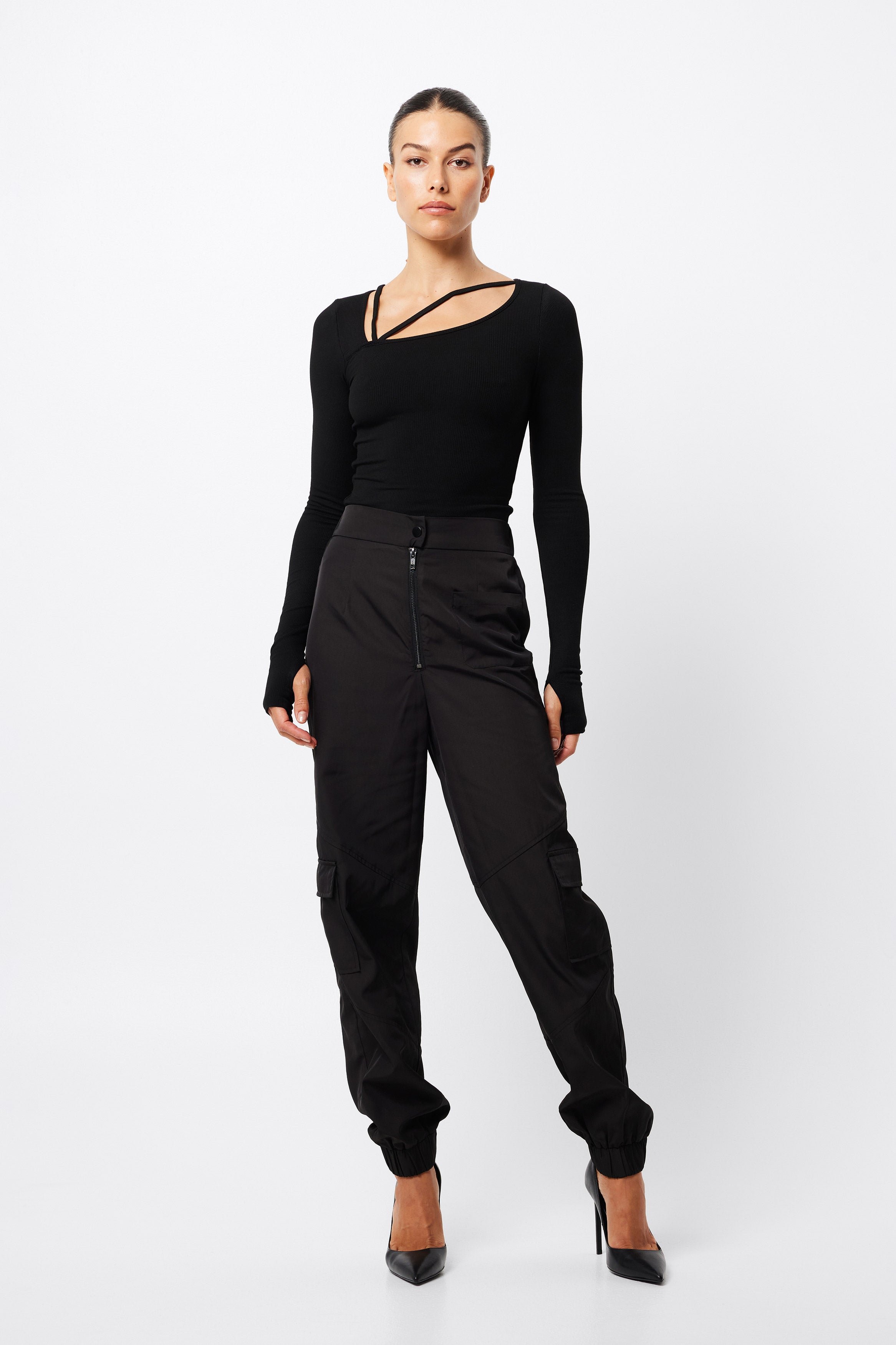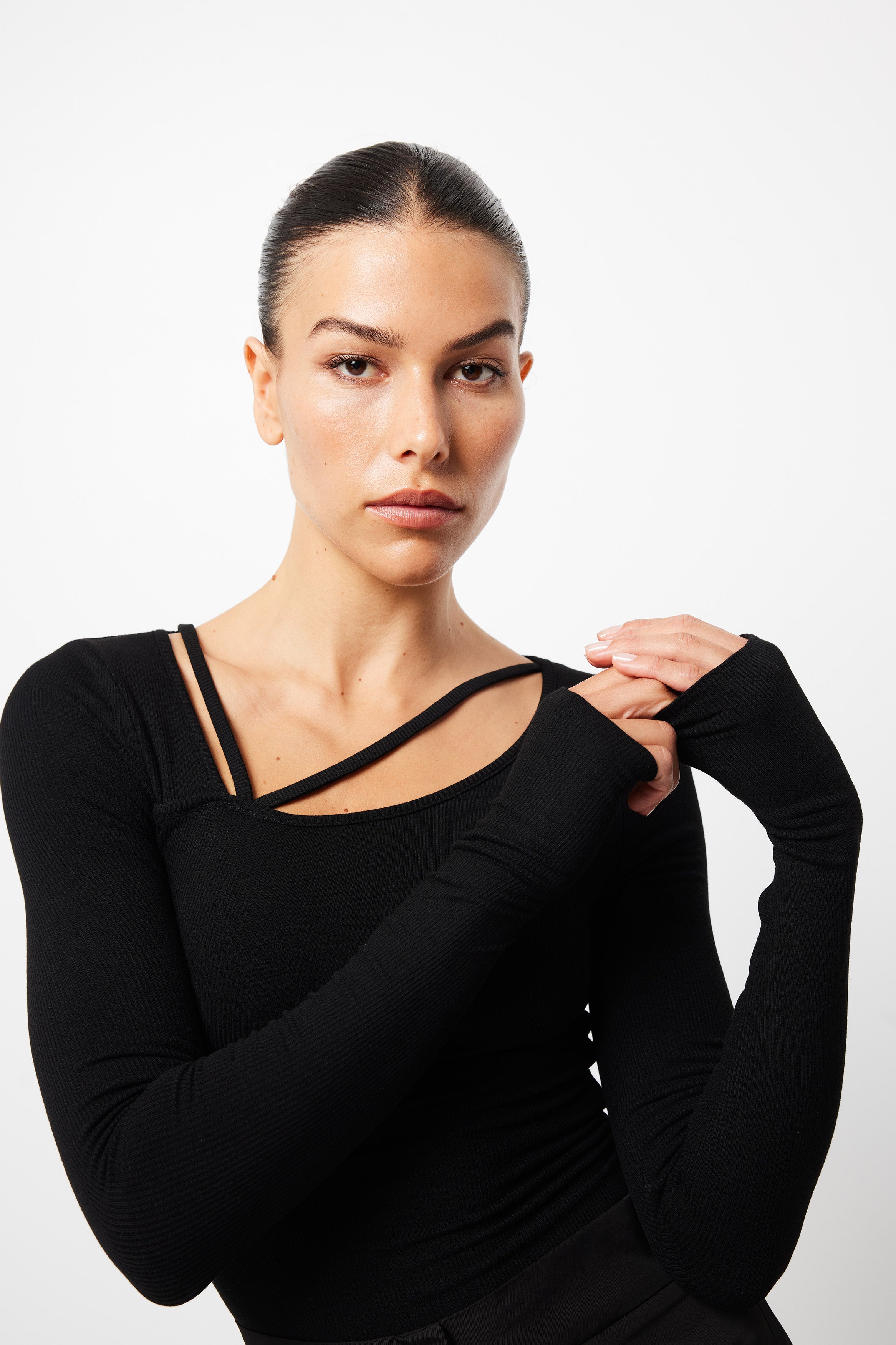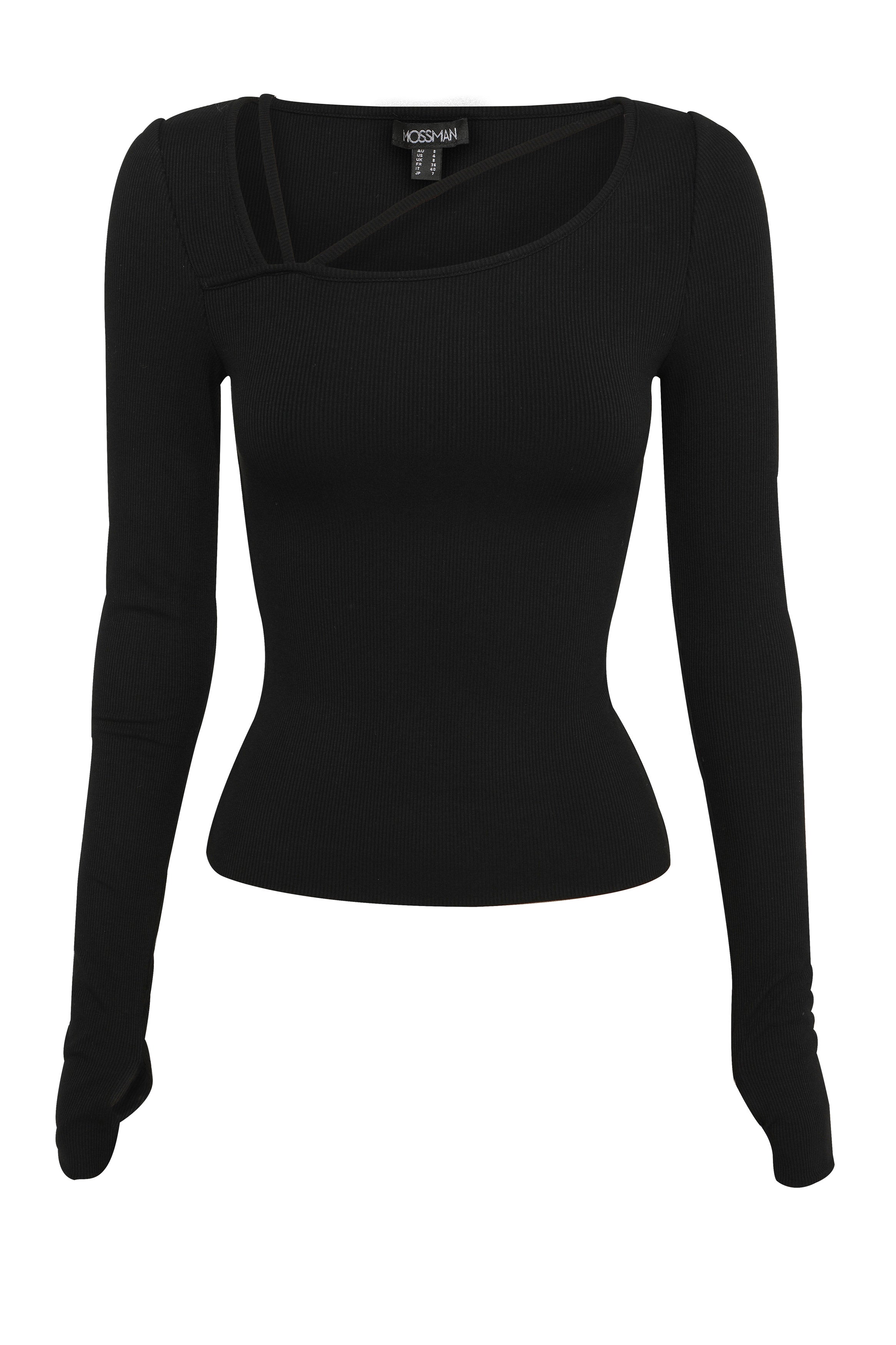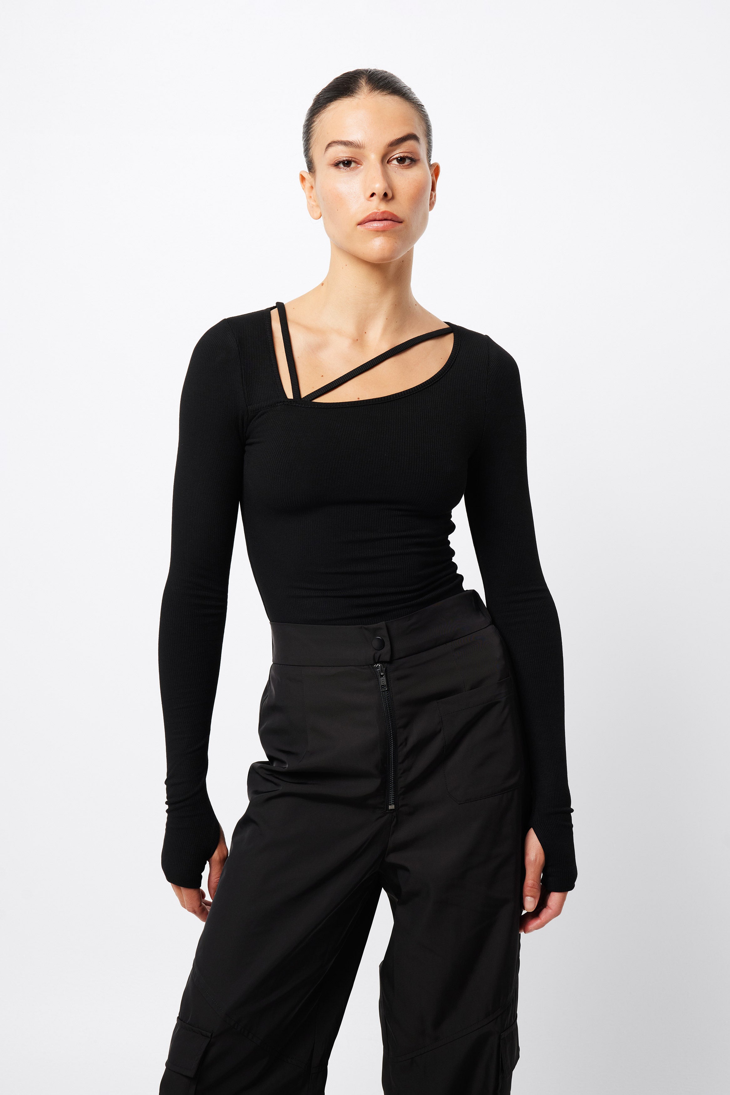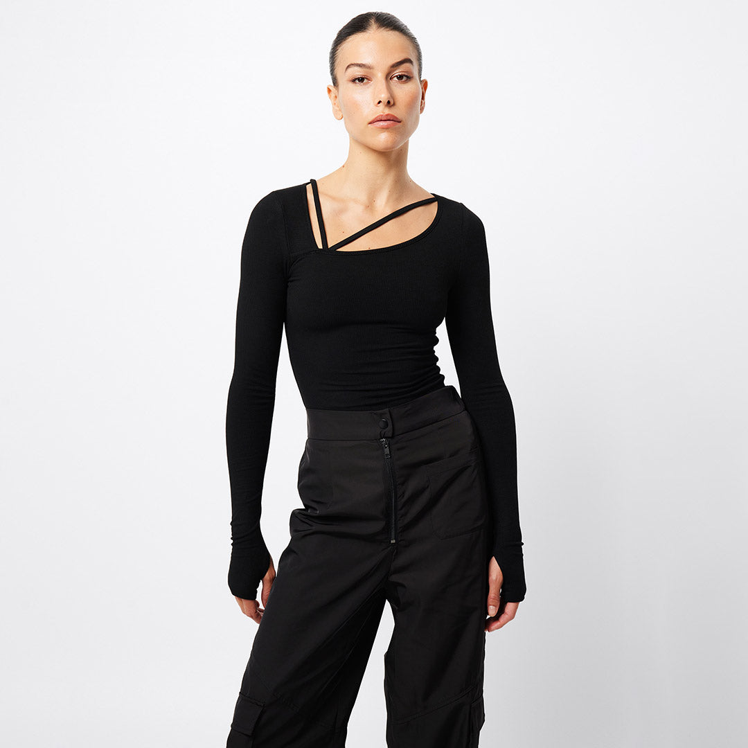 The Splice Top in black is your new go to trans seasonal piece. This soft ribbed fabric top features an asymmetric neckline with strap detail and long sleeves with thumb openings. This top can work with all your existing pieces and give them a fashion forward edge. Pair this with our Frequency jeans for a casual look.