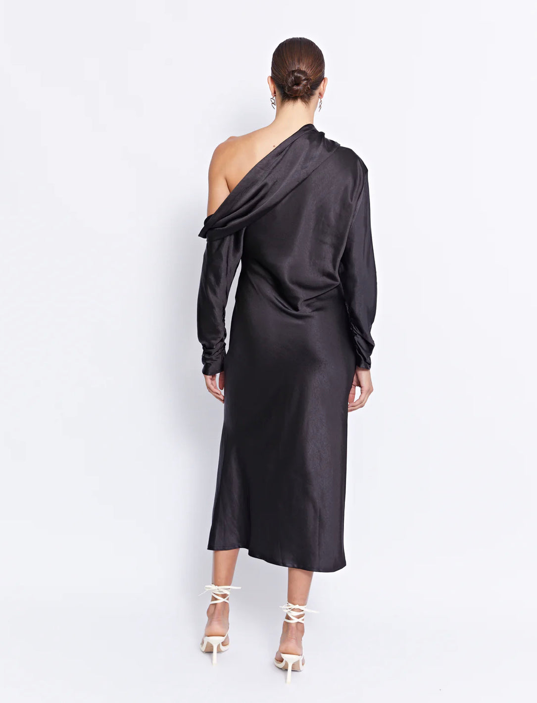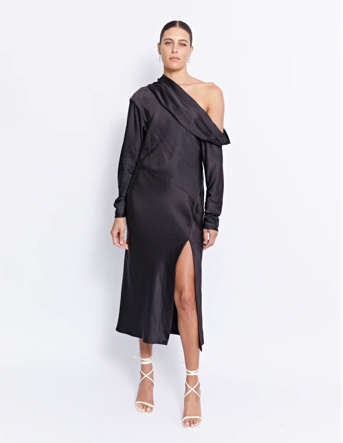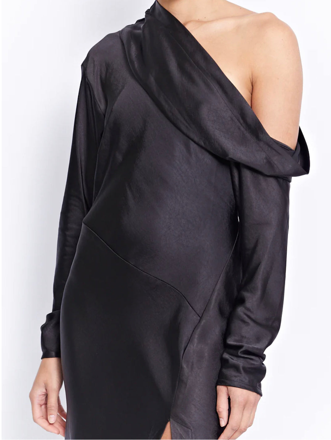 Embrace your inner goddess with this mesmerizing dress boasting a captivating cowl that gracefully cascades off one shoulder, a meticulously panelled bias cut body that creates a figure-flattering silhouette, and a daring thigh-high split that adds a dose of sultry sophistication to your ensemble.
